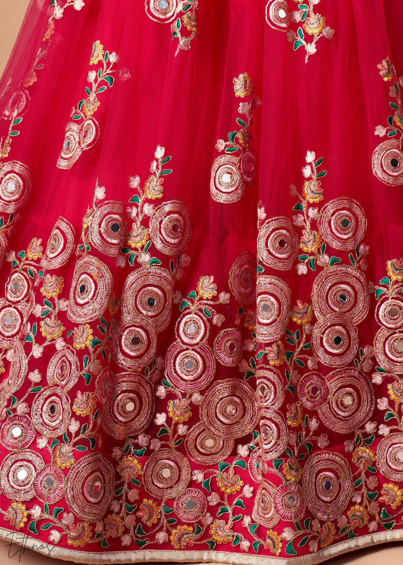 Deep Red Opulent Floral Mirror Net Lehenga