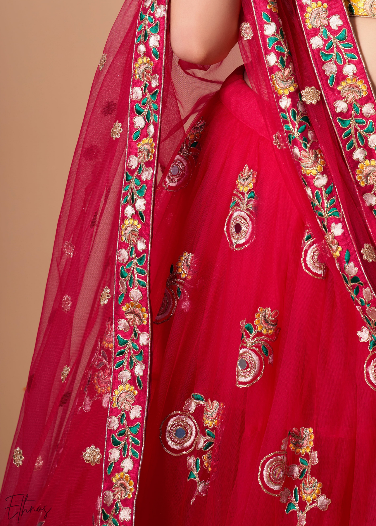 This deep red lehenga choli is crafted from fine net fabric and paired with a contrasting yellow silk blouse for a bold, festive look. The design features vibrant floral resham embroidery and intricate mirror work that adorns both the heavy borders and the scattered motifs throughout the ensemble. It is an exquisite choice for lively celebrations like mehndi ceremonies, sangeets, or wedding receptions.