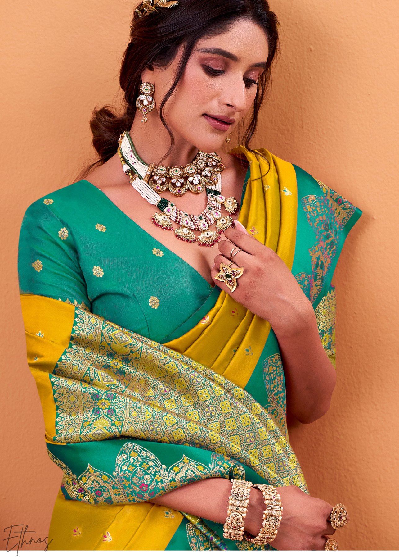 Shine in this vibrant yellow satin silk saree, featuring intricate zari motifs and a stunning teal blue border. The lustrous finish of the soft silk fabric highlights the detailed weaving, ensuring a luxurious look and feel. This piece is ideal for those special events where you want to make a truly bright and sophisticated impression.