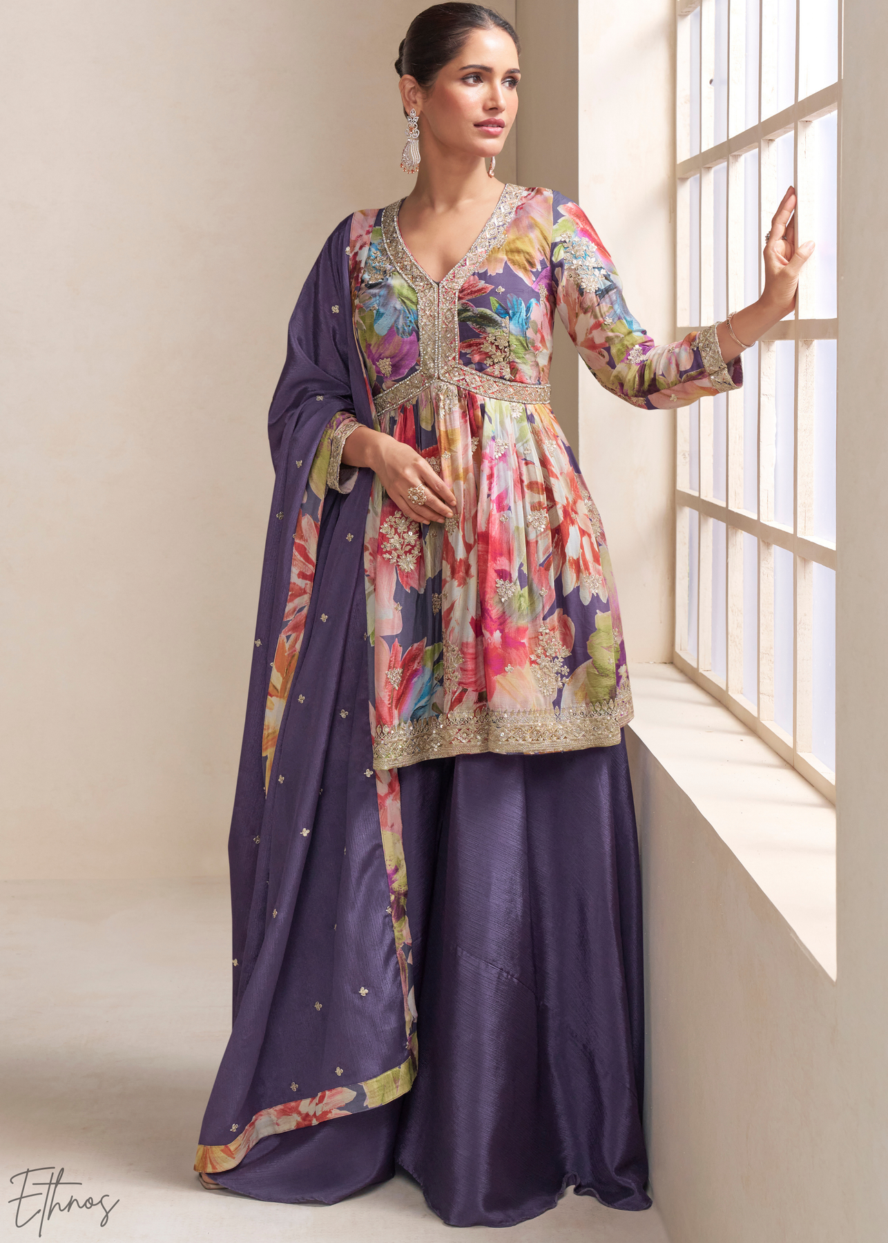 This elegant festive ensemble features a multicolor floral printed peplum-style kurti crafted from premium real chinon fabric with intricate embroidery. The set is completed with a matching solid purple palazzo and a delicate chinon dupatta, creating a sophisticated and contemporary ethnic look perfect for sangeet ceremonies, festive soirées, or traditional holiday.