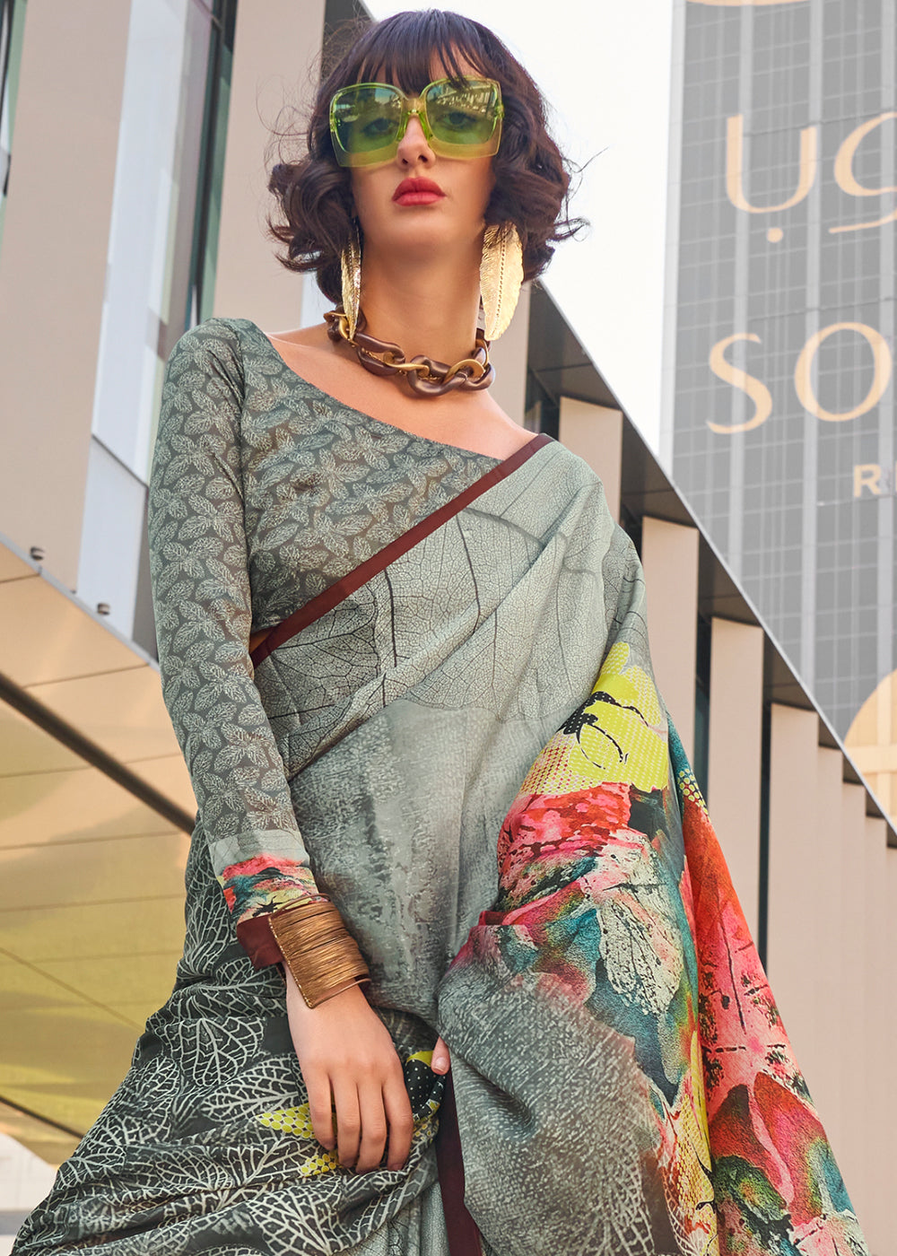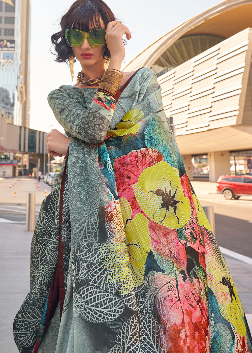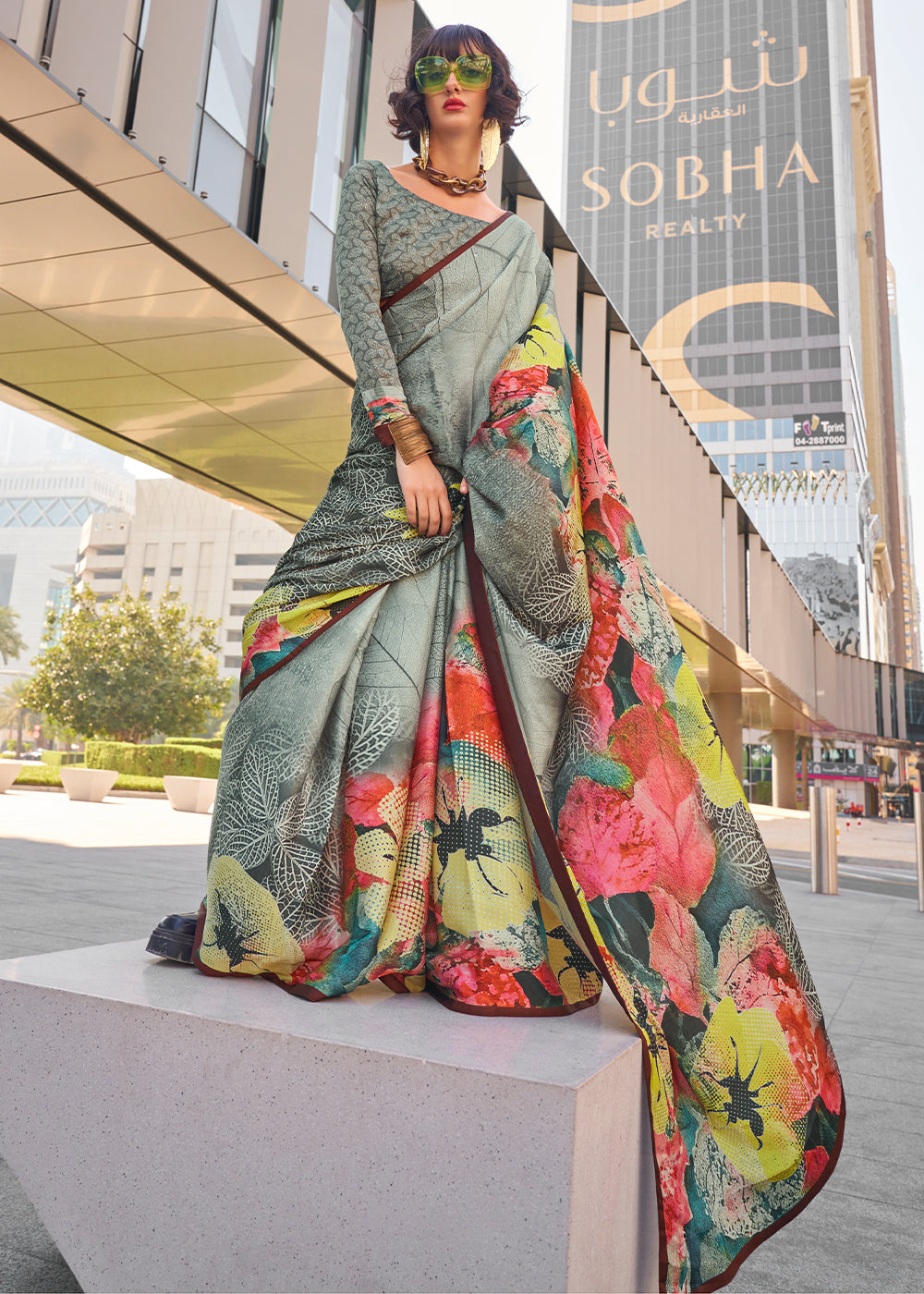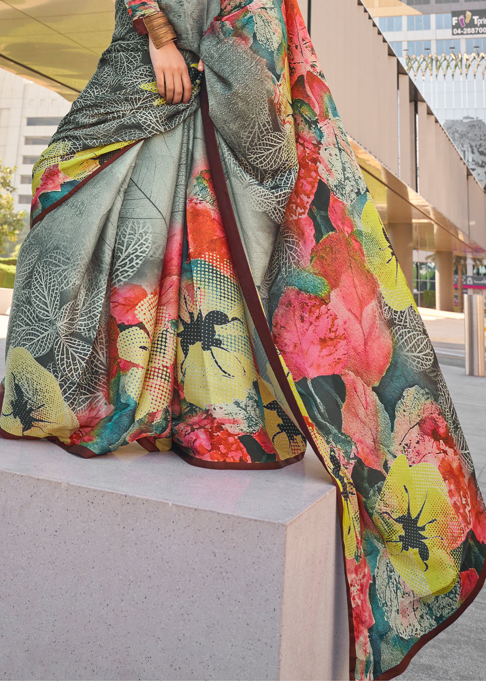 Light Grey Digital Printed Satin Crepe Designer Saree