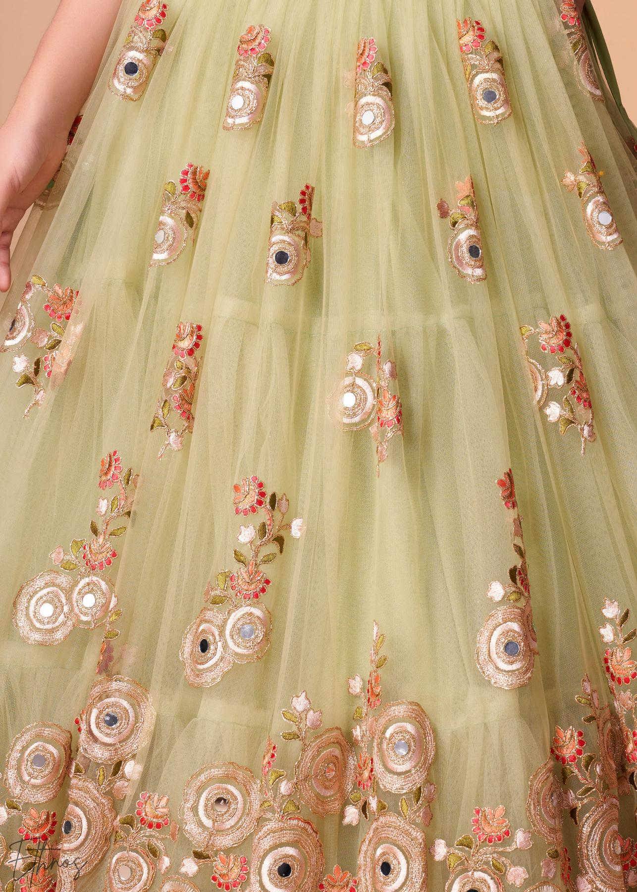 Lehenga: Soft net with zari, dori, sequins & mirror embellishment.