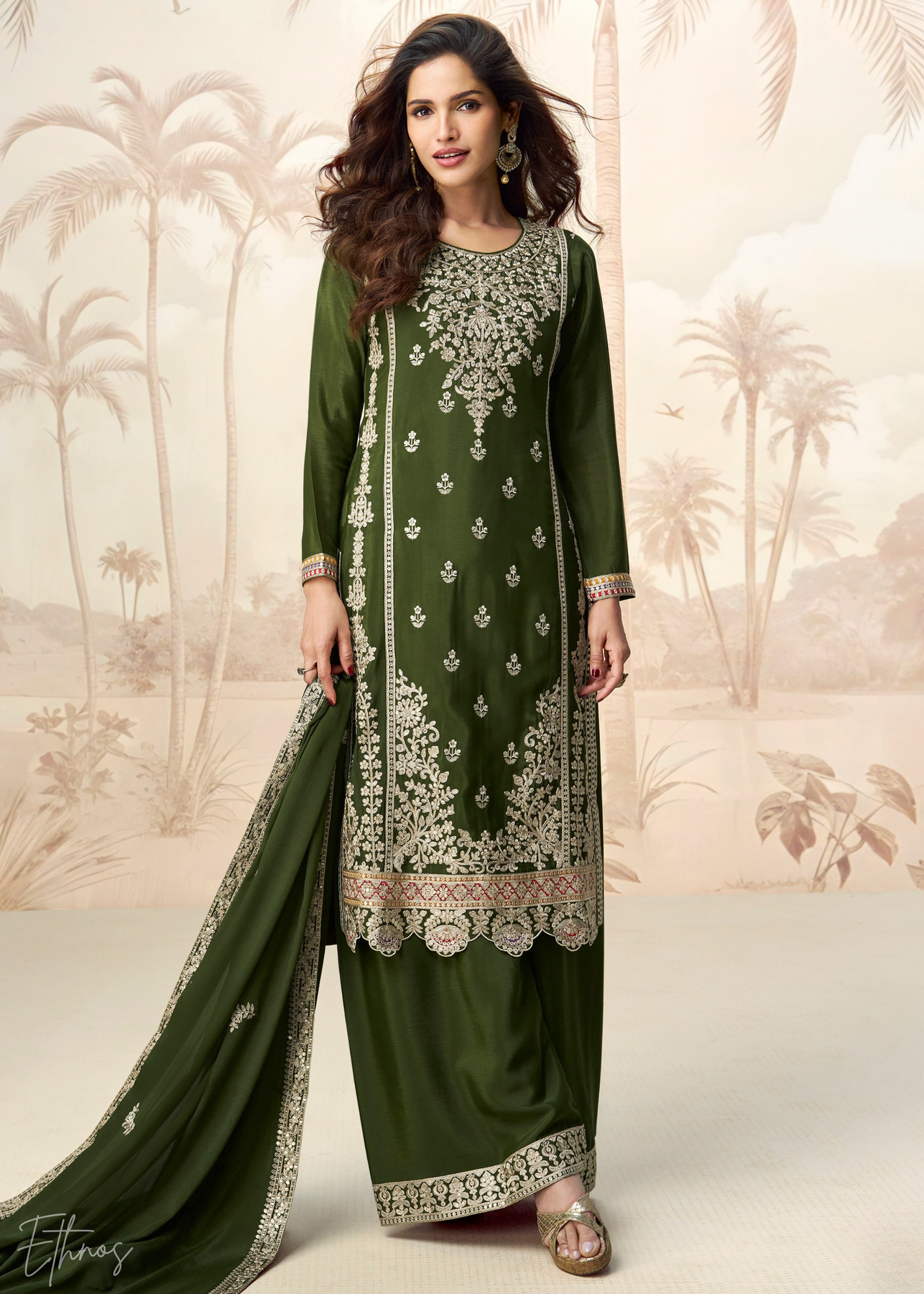 The Moss Green Chinnon Silk Palazzo Suit is a beautiful blend of traditional elegance and modern style. Crafted from soft chinon silk, the outfit includes a stylish kurta, flowing palazzo pants, and a matching dupatta for a graceful look. Intricate embroidery and the vibrant pink shade enhance its festive charm and sophistication. This elegant ensemble is perfect for weddings, celebrations, and special occasions where you want to stand out.
