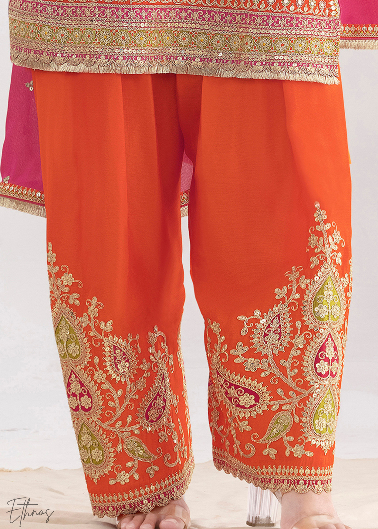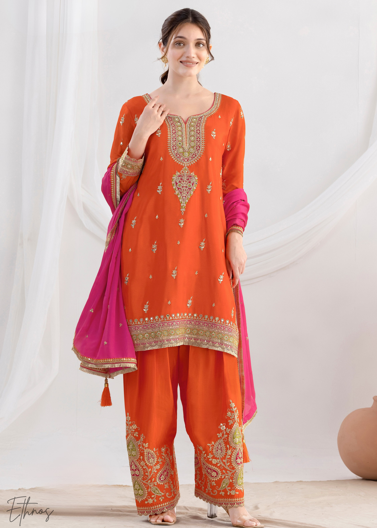 This pumpkin orange chinnon silk salwar suit blends vibrant color with elegant golden embroidery, creating a stunning festive look. Crafted from premium chinnon silk, the top, bottom, and dupatta offer a luxurious feel with graceful drape. The radiant pink shade adds energy and charm, making it perfect for weddings, parties, and cultural celebrations. Stylish yet comfortable, this outfit beautifully combines traditional elegance with modern appeal.