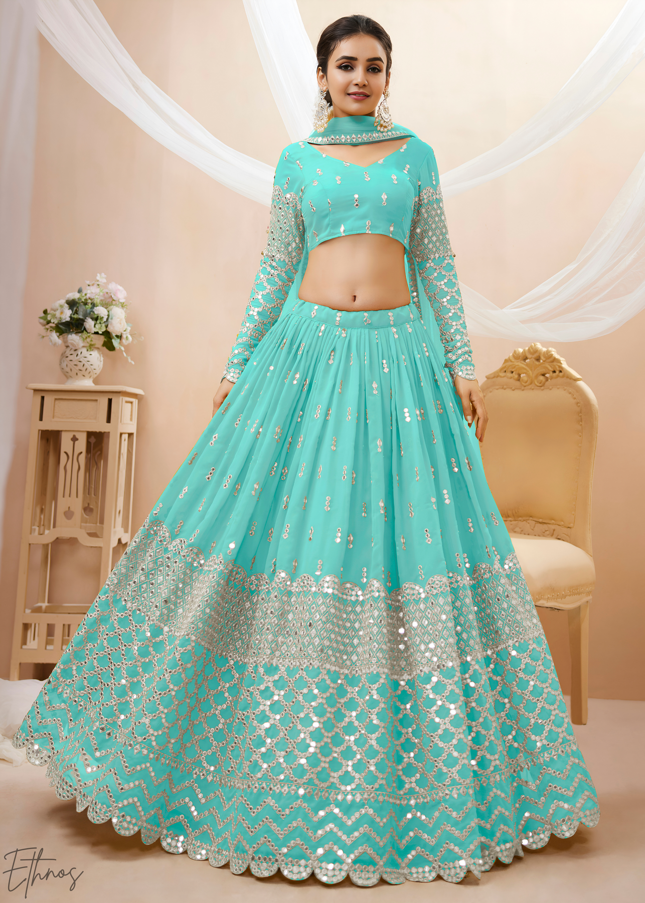 This sea green lehenga in premium georgette fabric is embellished with sequins and zari embroidery, paired with a blouse featuring matching detailing. A sheer soft-net dupatta with sequins and zari completes the ensemble with radiant elegance. Perfect for weddings, festive occasions, receptions, engagement ceremonies, and cultural celebrations.