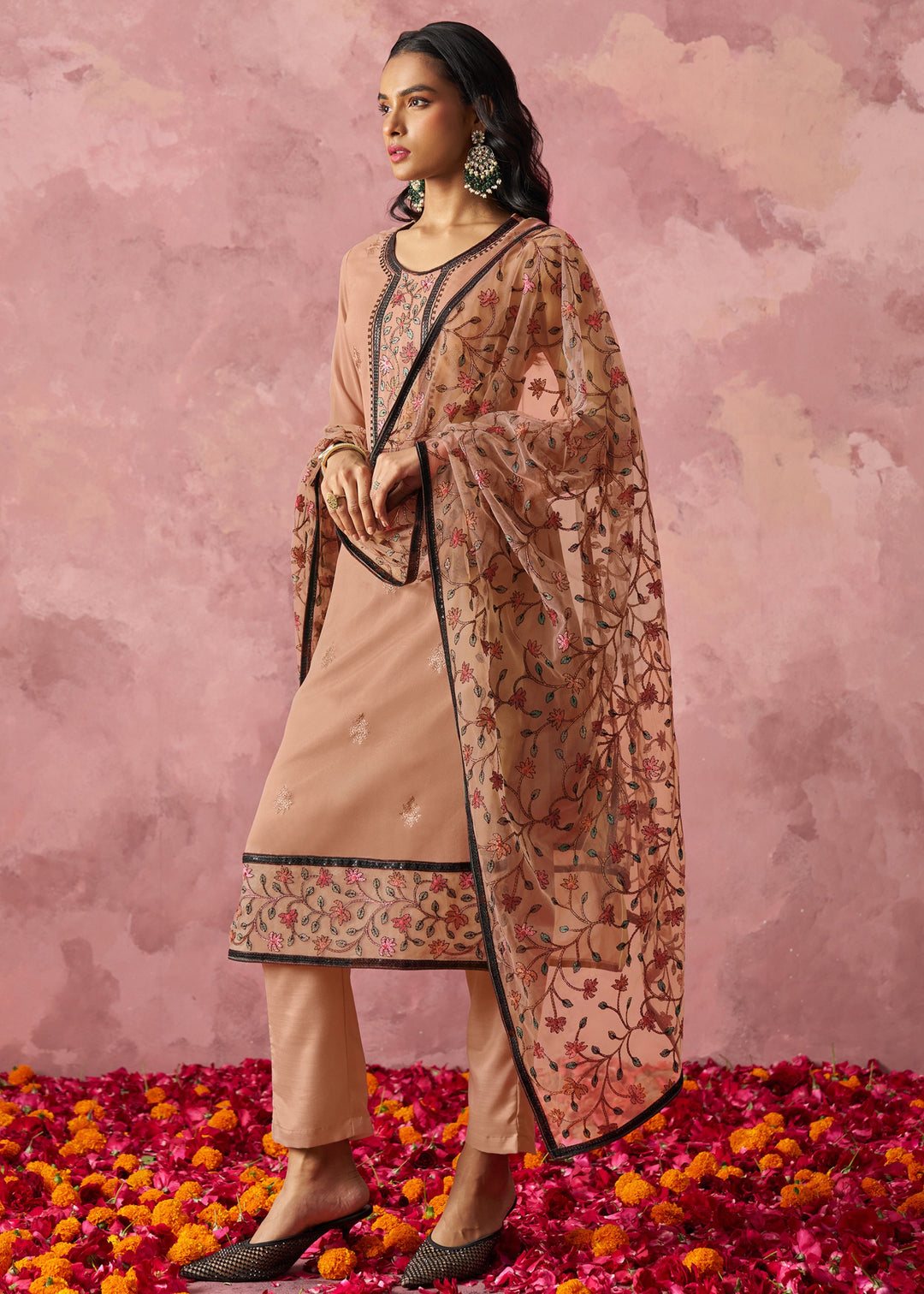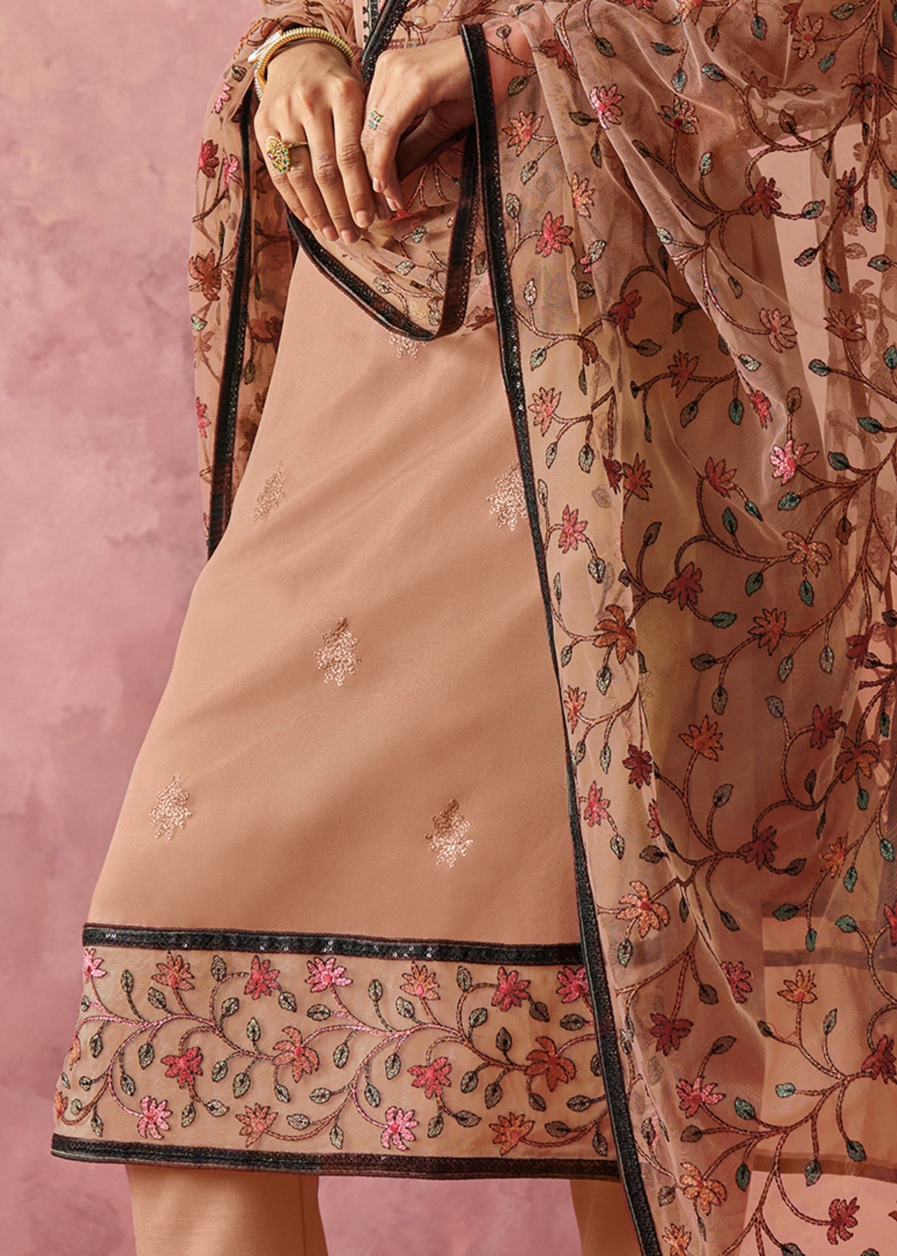 Tan Brown Georgette Suit With Thread Embroidered Work