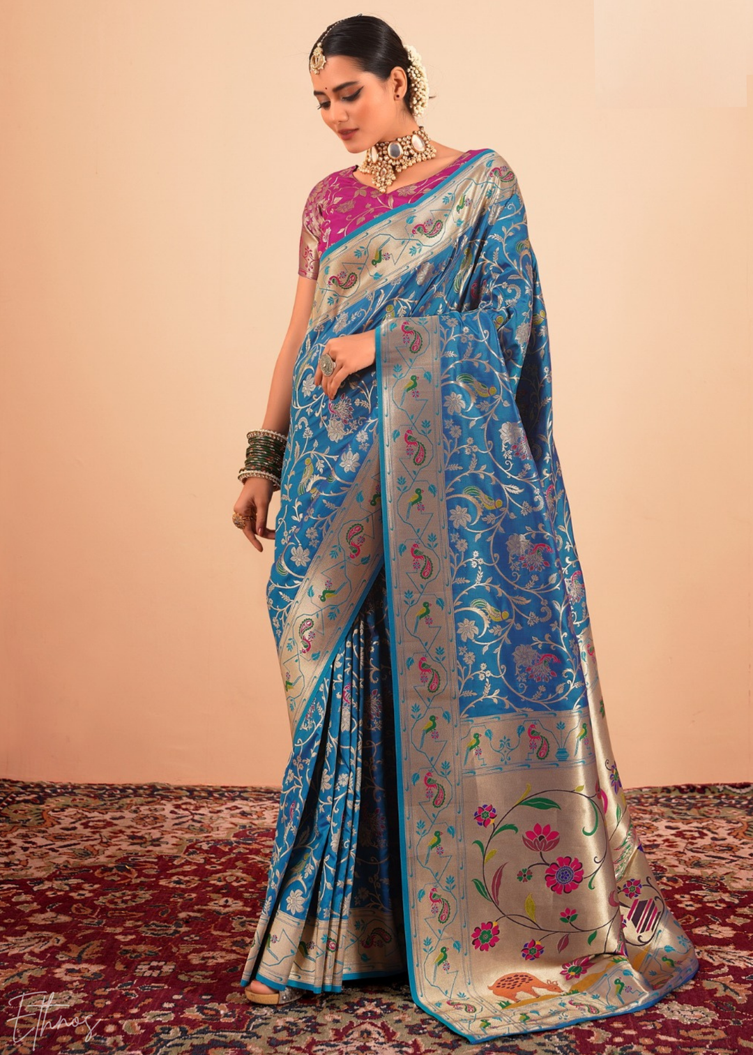 Aegean Blue Menagerie Paithani Silk Saree