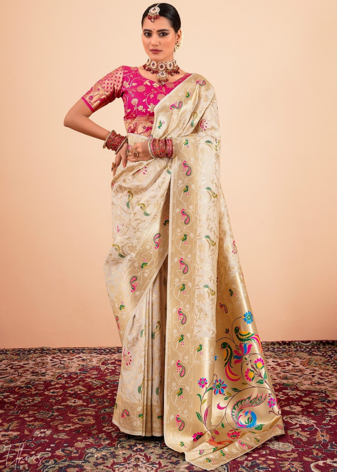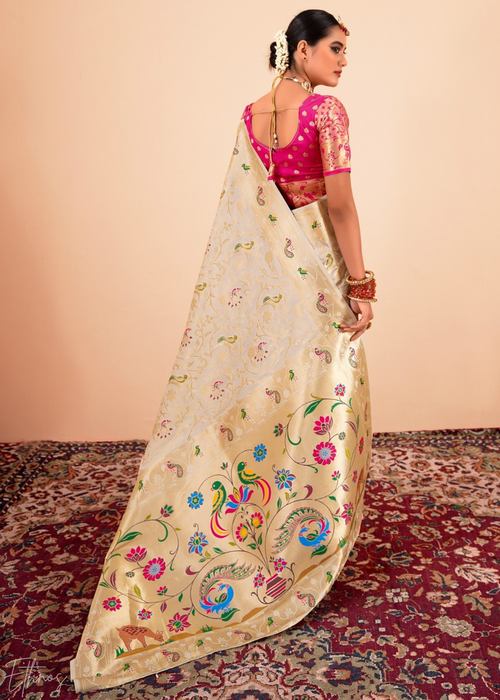 Champagne Cream Menagerie Paithani Silk Saree