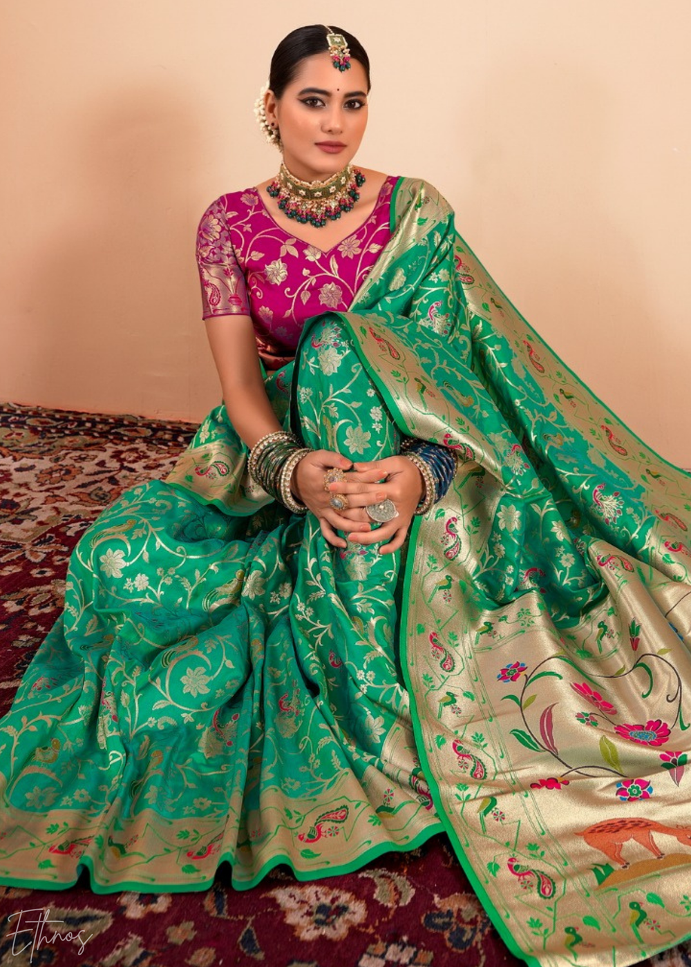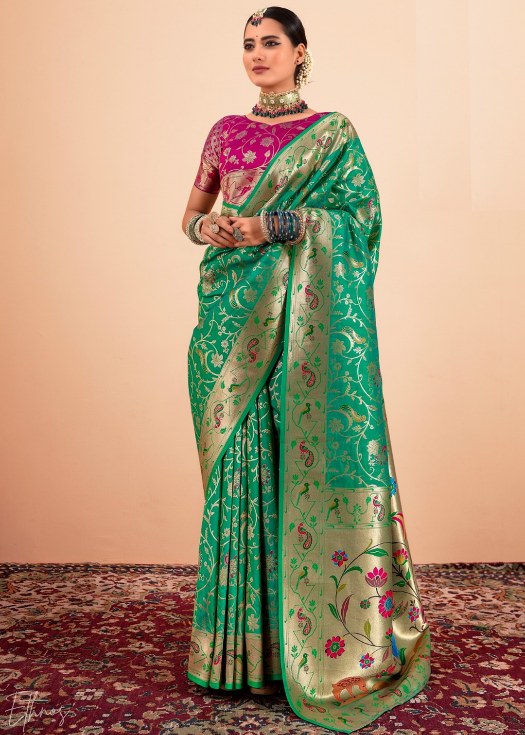 Emerald Jade Menagerie Paithani Silk Saree