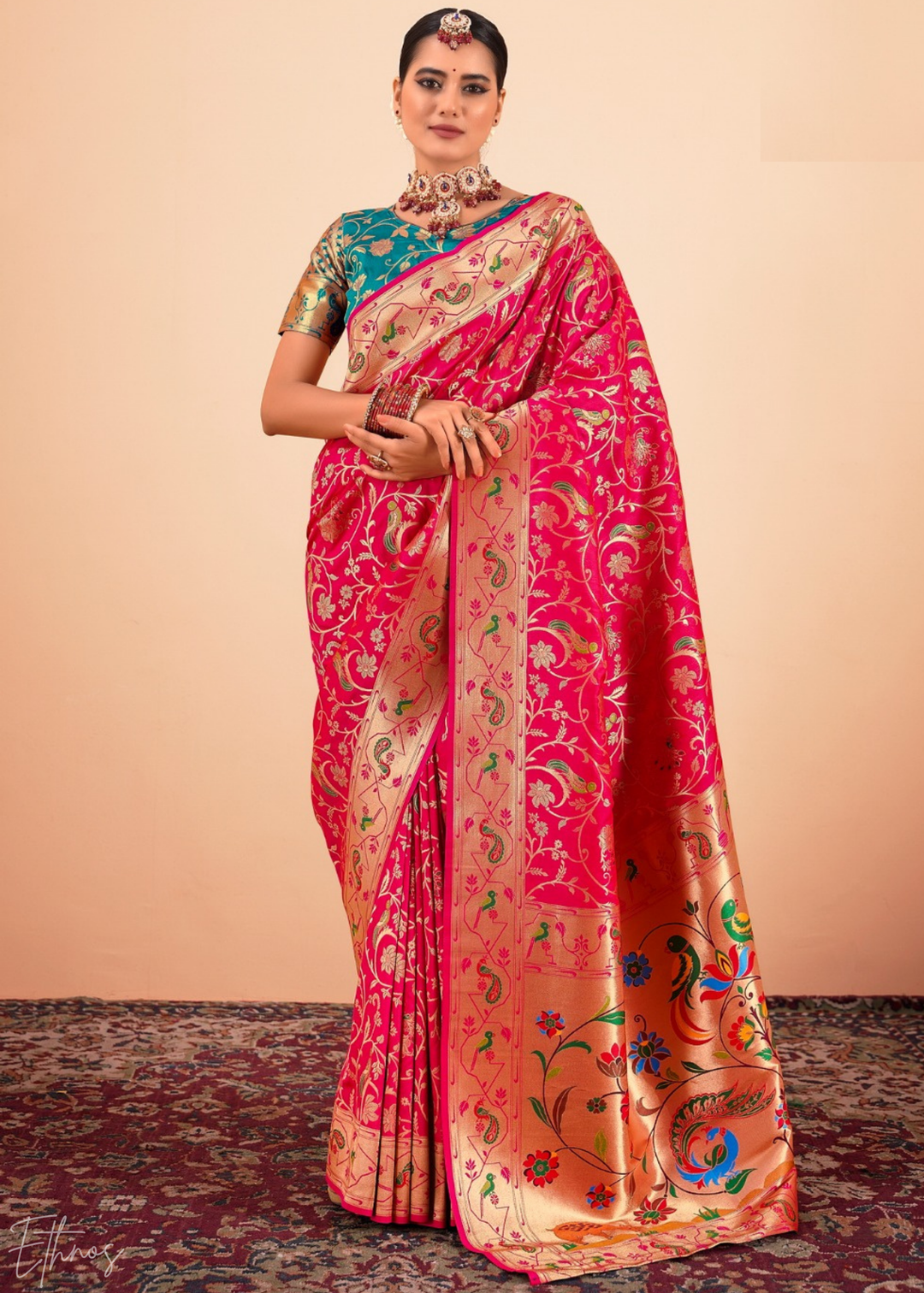 Rosewood Pink Menagerie Paithani Silk Saree