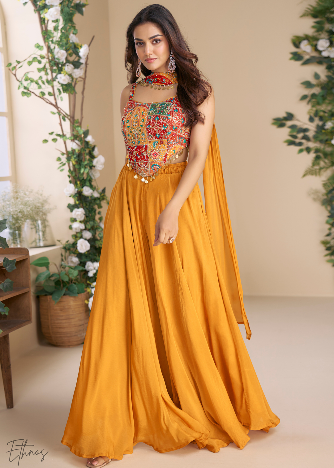 Multicolored Yellow Chinnon Silk Palazzo Suit