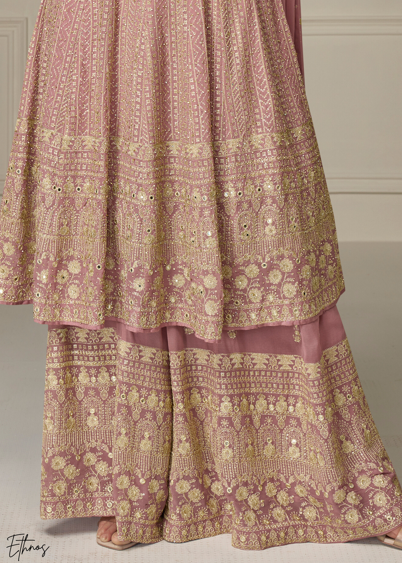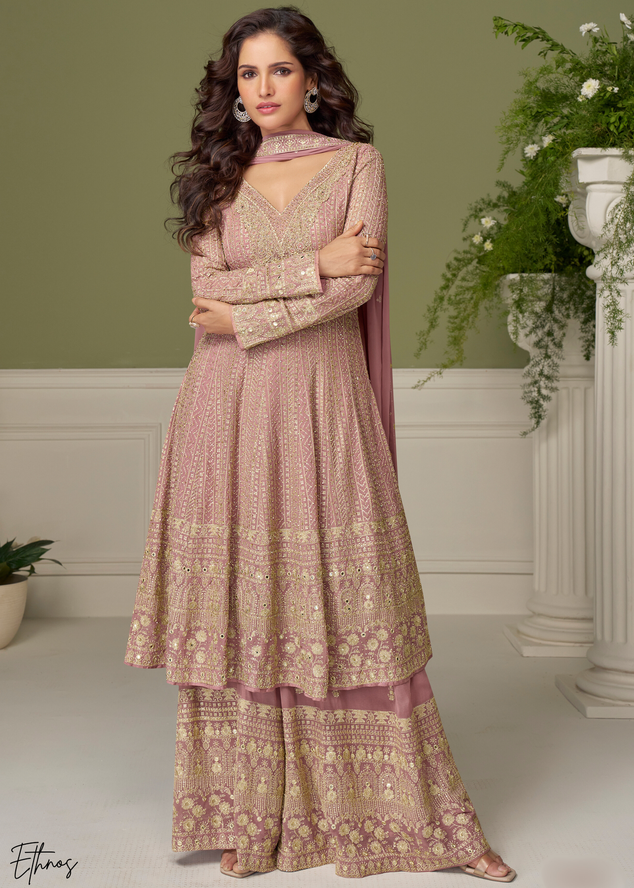 Embrace timeless elegance with this captivating dusty pink suit, designed with a georgette top and a flowy matching bottom. The rich fabric and detailed floral embroidery in a lighter hue make it a captivating choice. This beautiful outfit is well-suited for both casual elegance and formal events, ensuring a chic and graceful appearance for all occasions.
