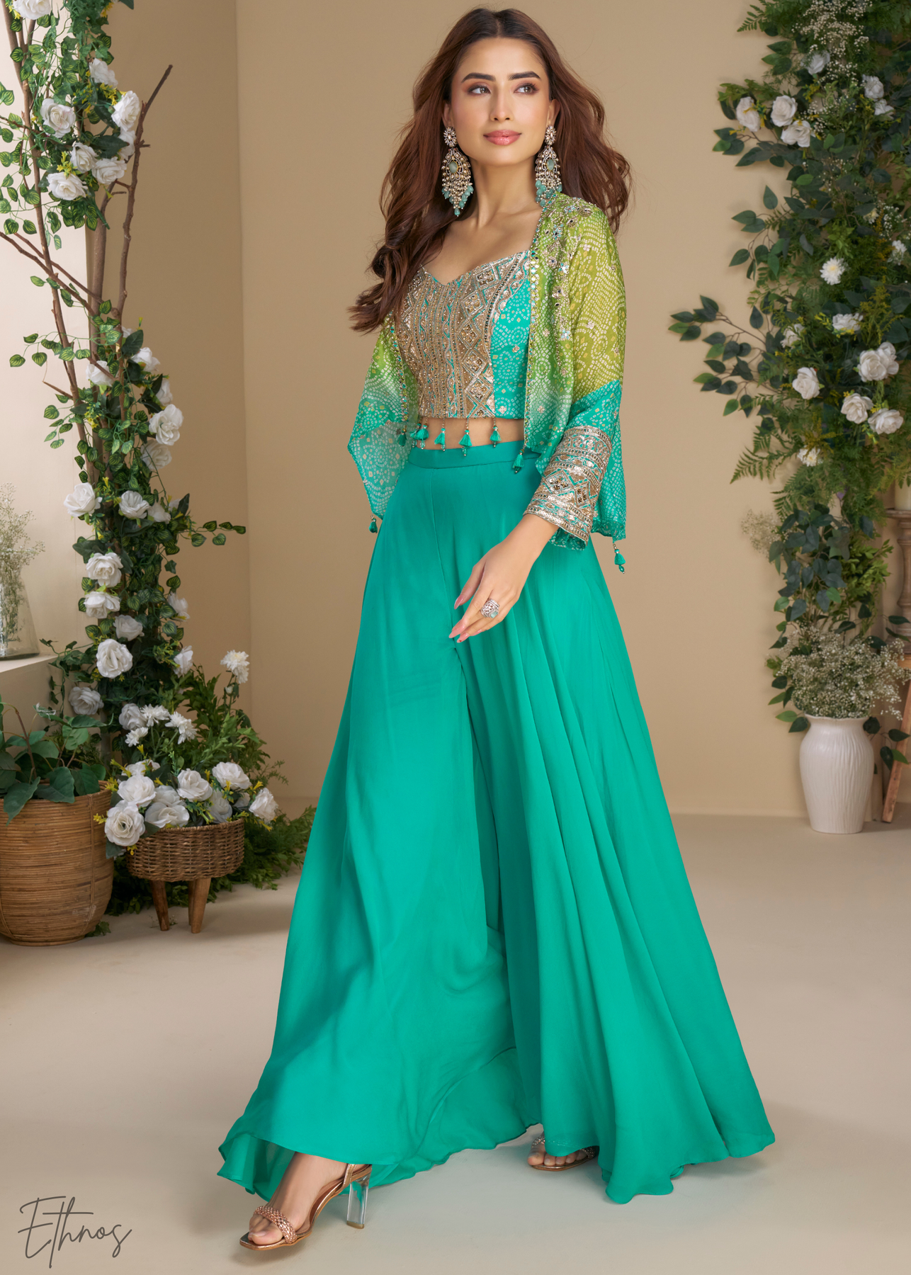 Sea Green Chinon Shrug & Choli Palazzo Suit