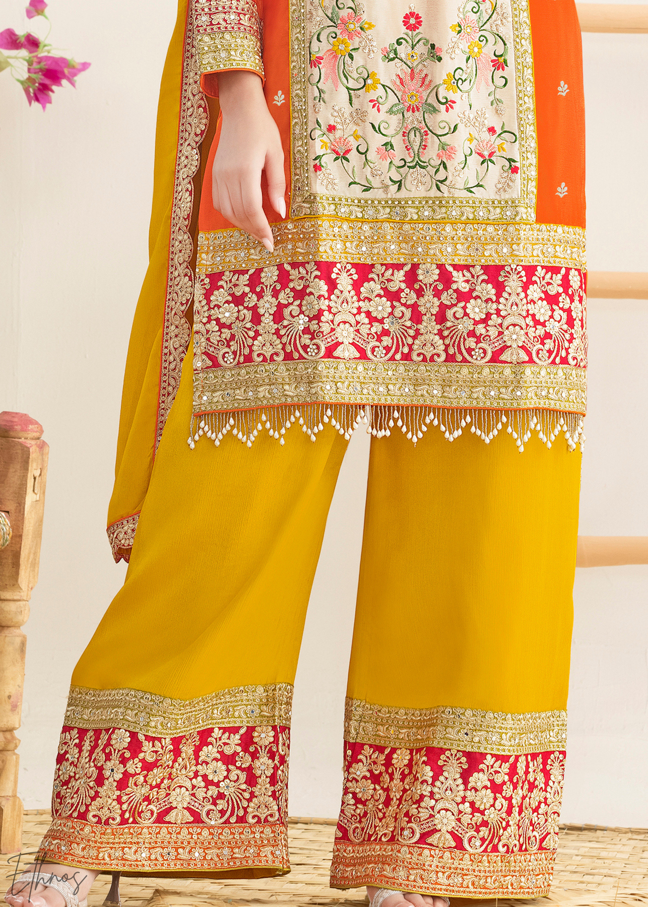 Mustard & Orange Embroidered Chinon Palazzo Suit