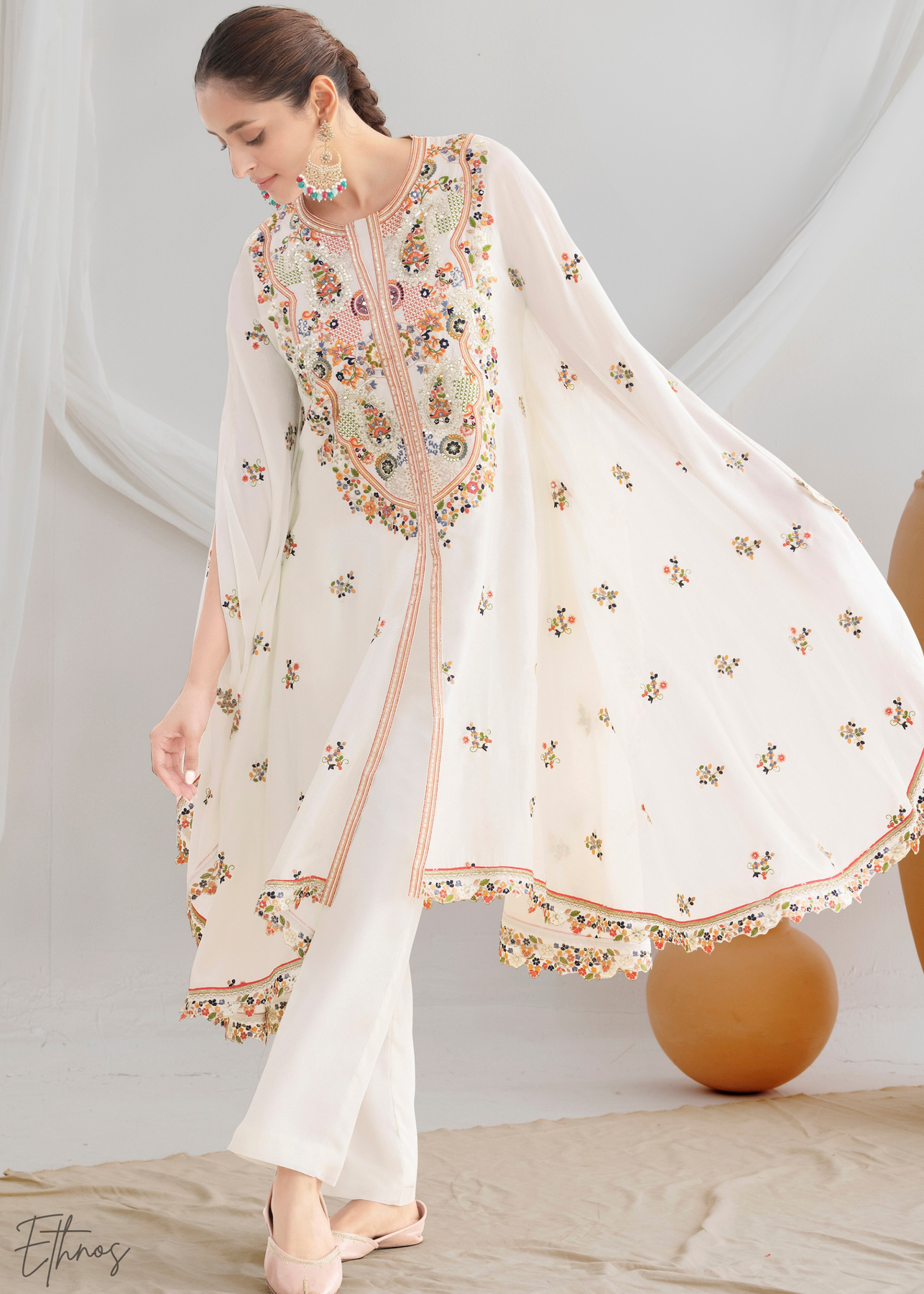 Elevate your wardrobe with this stunning white ensemble that's pure magic. The kaftaan drapes beautifully in premium chinon, adorned with gorgeous dabka dori floral embroidery that catches every eye. Pair it with the matching straight palazzo pants—also crafted from luxurious chinon—for a look that's effortlessly chic and absolutely unforgettable at discerning occasions.
