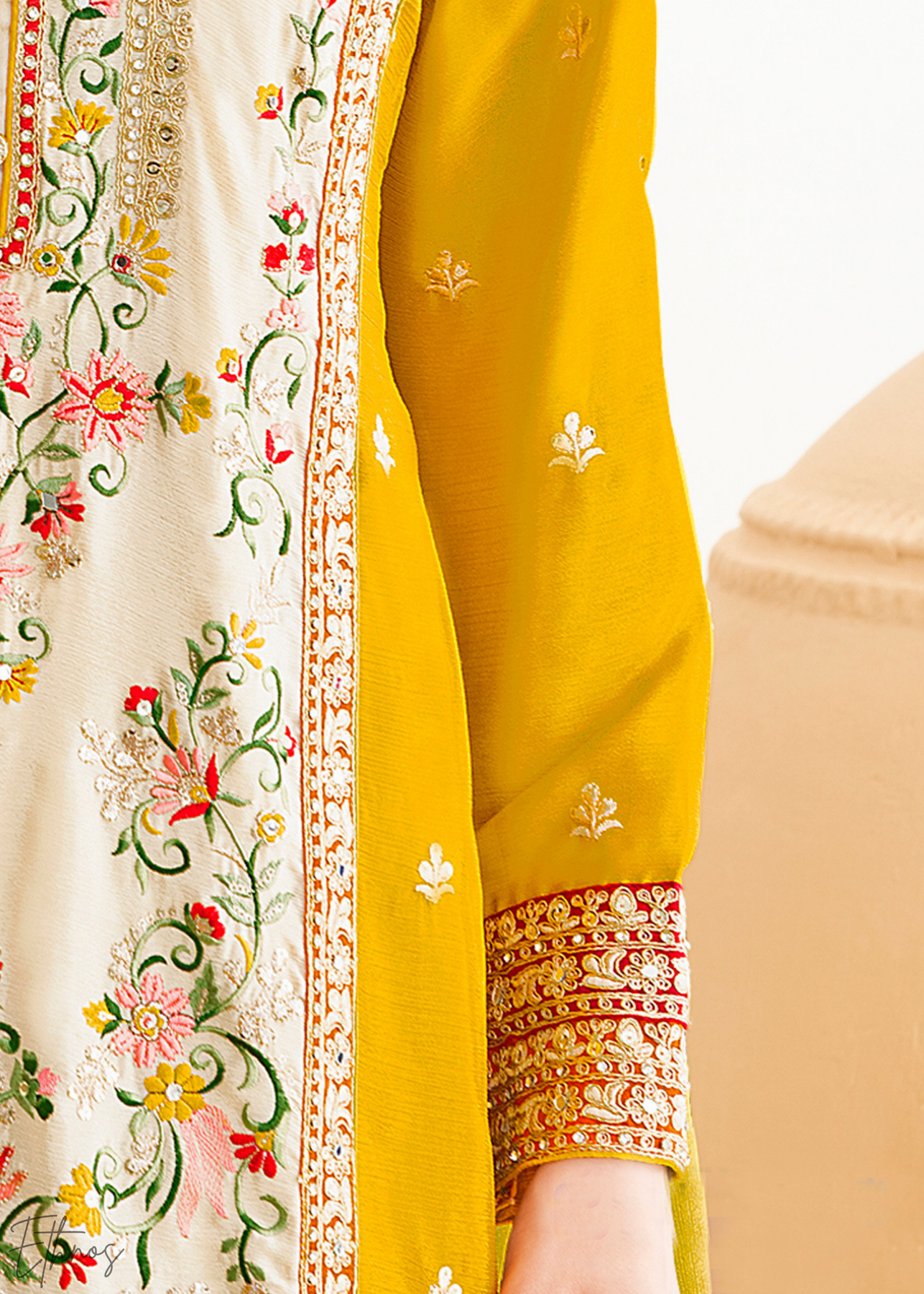 Bottom Fabric: Chinon fabric adorned with embroidery on the border.