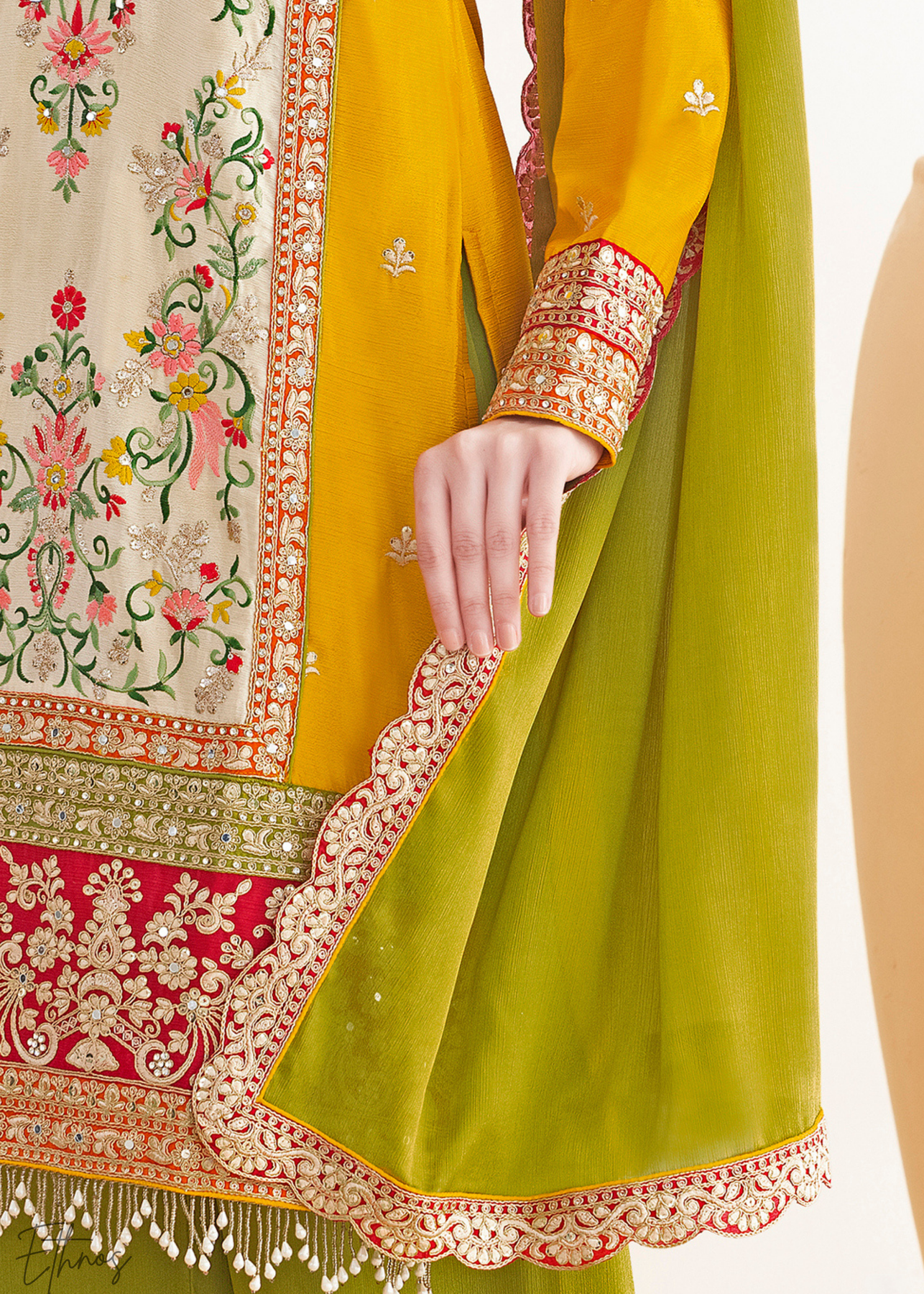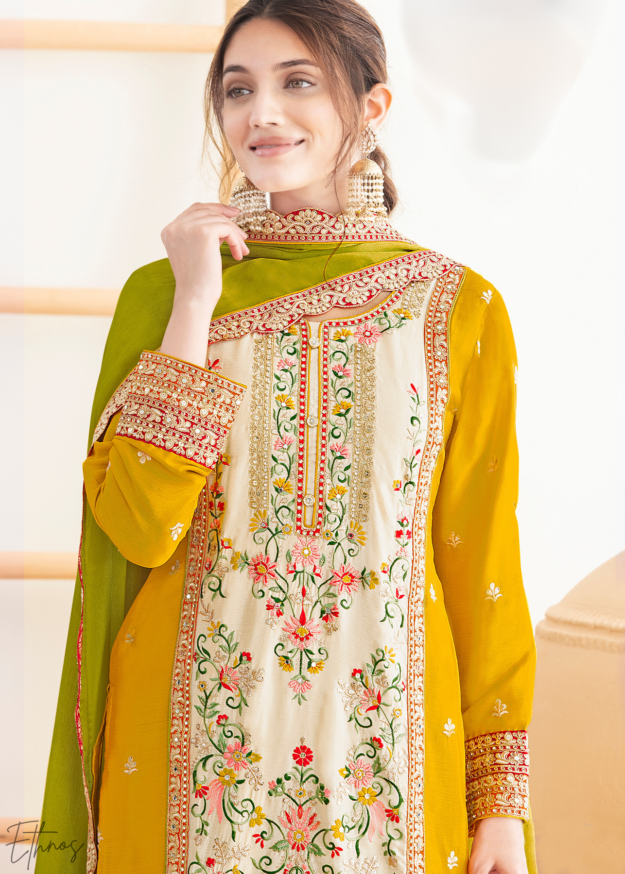 Mustard & Green Embroidered Chinon Palazzo Suit