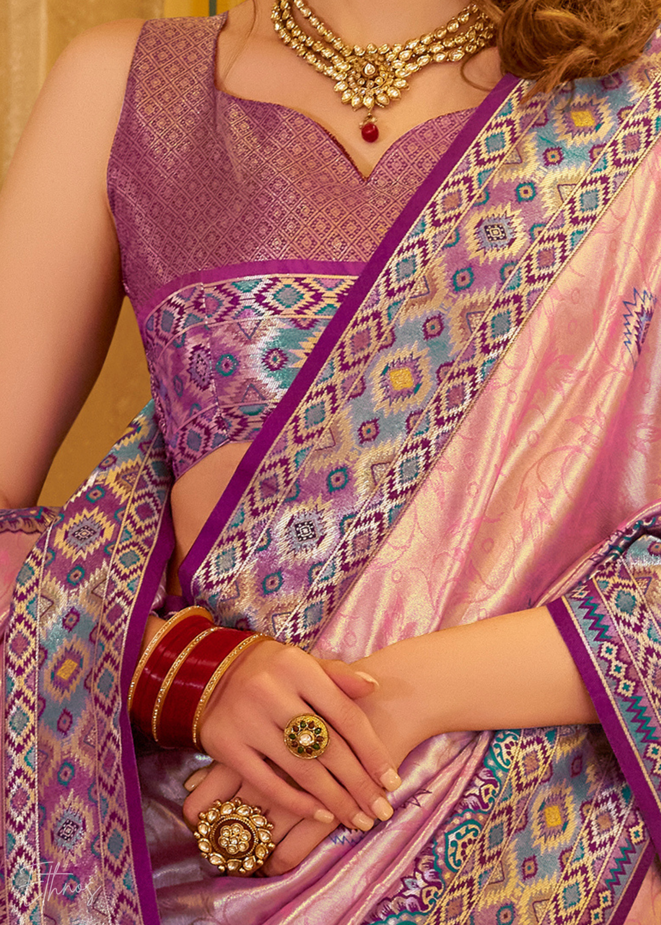 Saree Fabric: Tissue art silk embellished with patola inspired motifs.