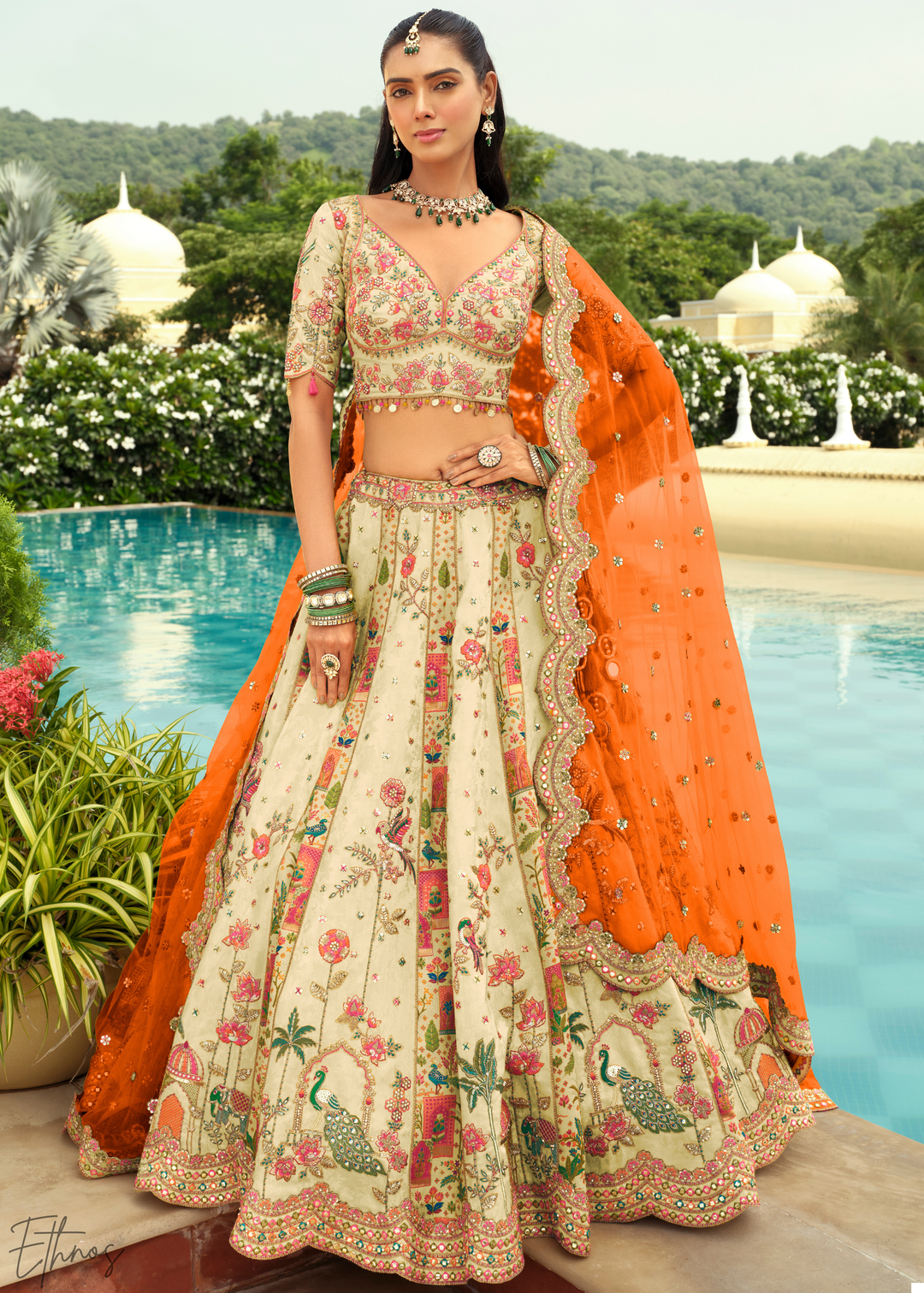 Ivory & Orange Embroidered Silk Lehenga