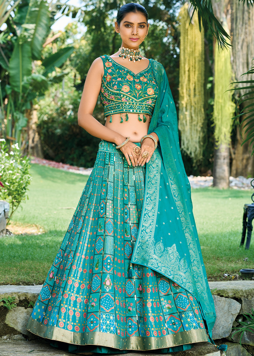 Turquoise Blue Ready to Wear Designer Silk Lehenga Choli with Sparkle & Mirror work