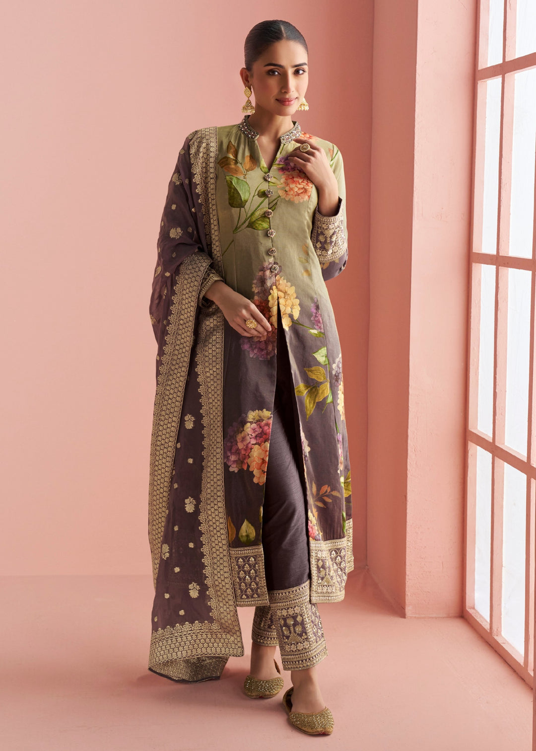 Tea Green Digital Floral Printed Chinon Suit with Embroidery work