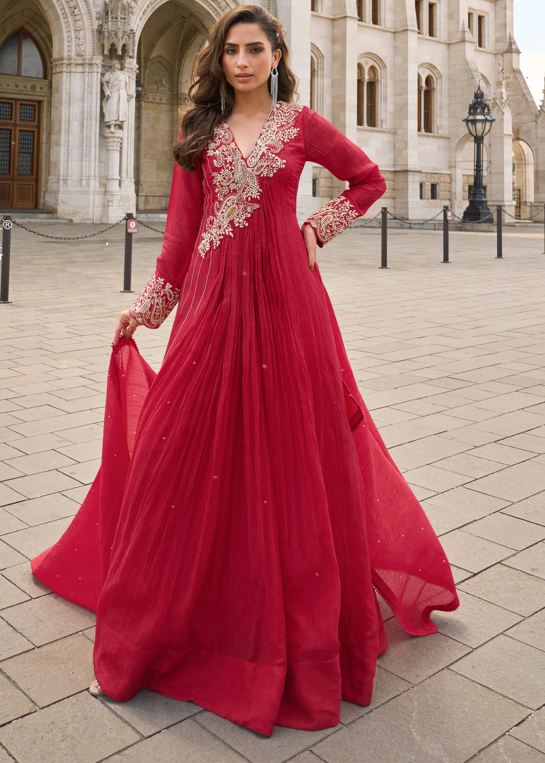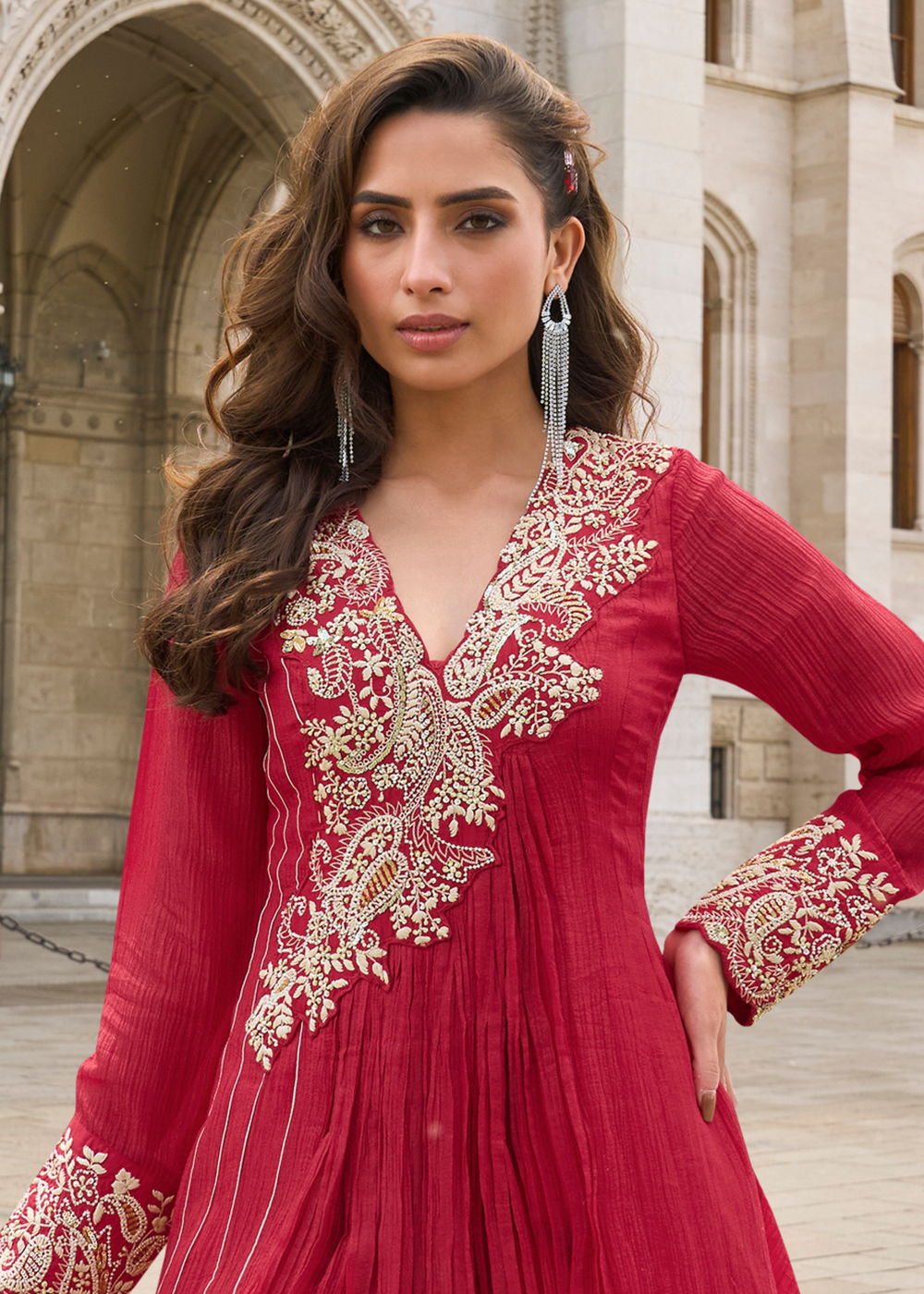 Maroon Red Simmer Silk Palazzo Suit With Embroidered Work