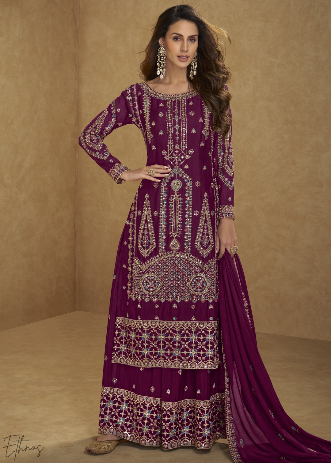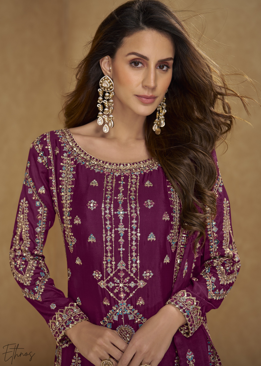 Imperial Wine Zari-Encrusted Chinon Palazzo Suit