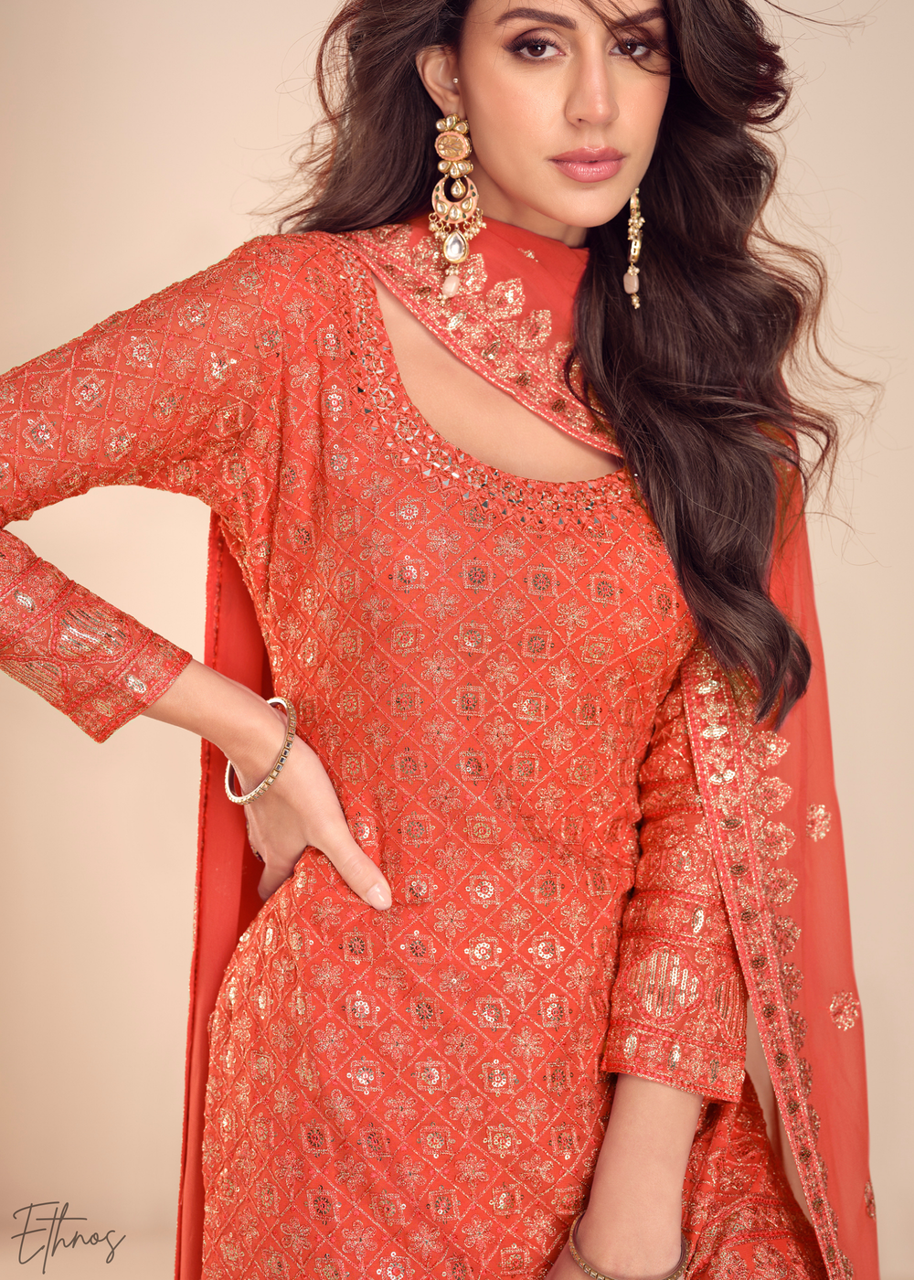 Rust Arabesque Embroidered Shimmer Silk Palazzo Suit