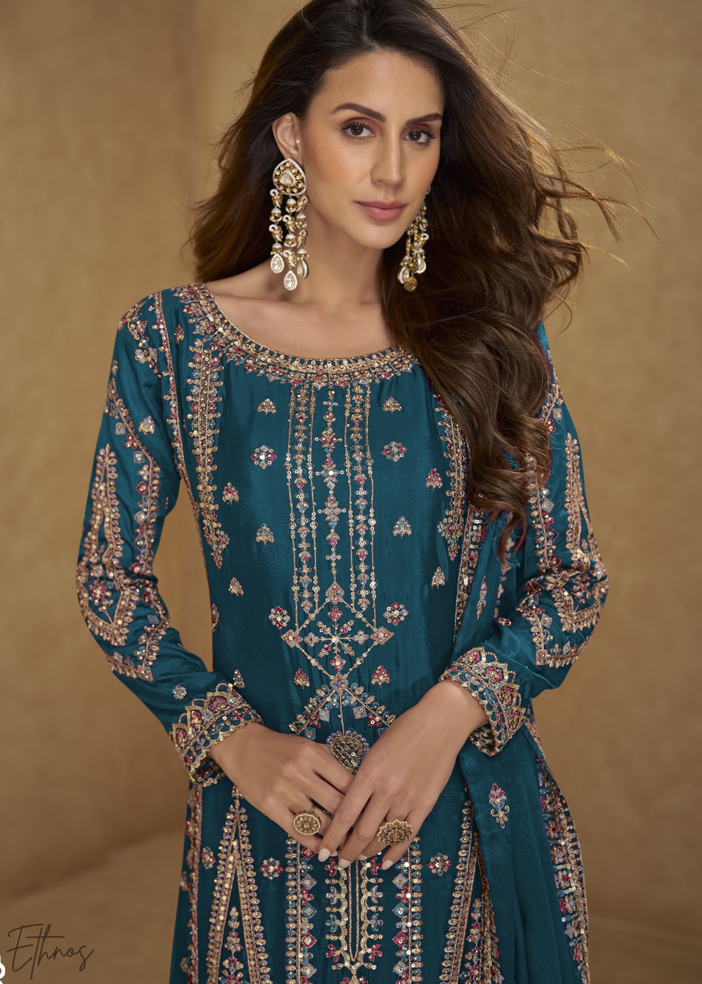 Teal Blue Zari-Encrusted Chinon Palazzo Suit