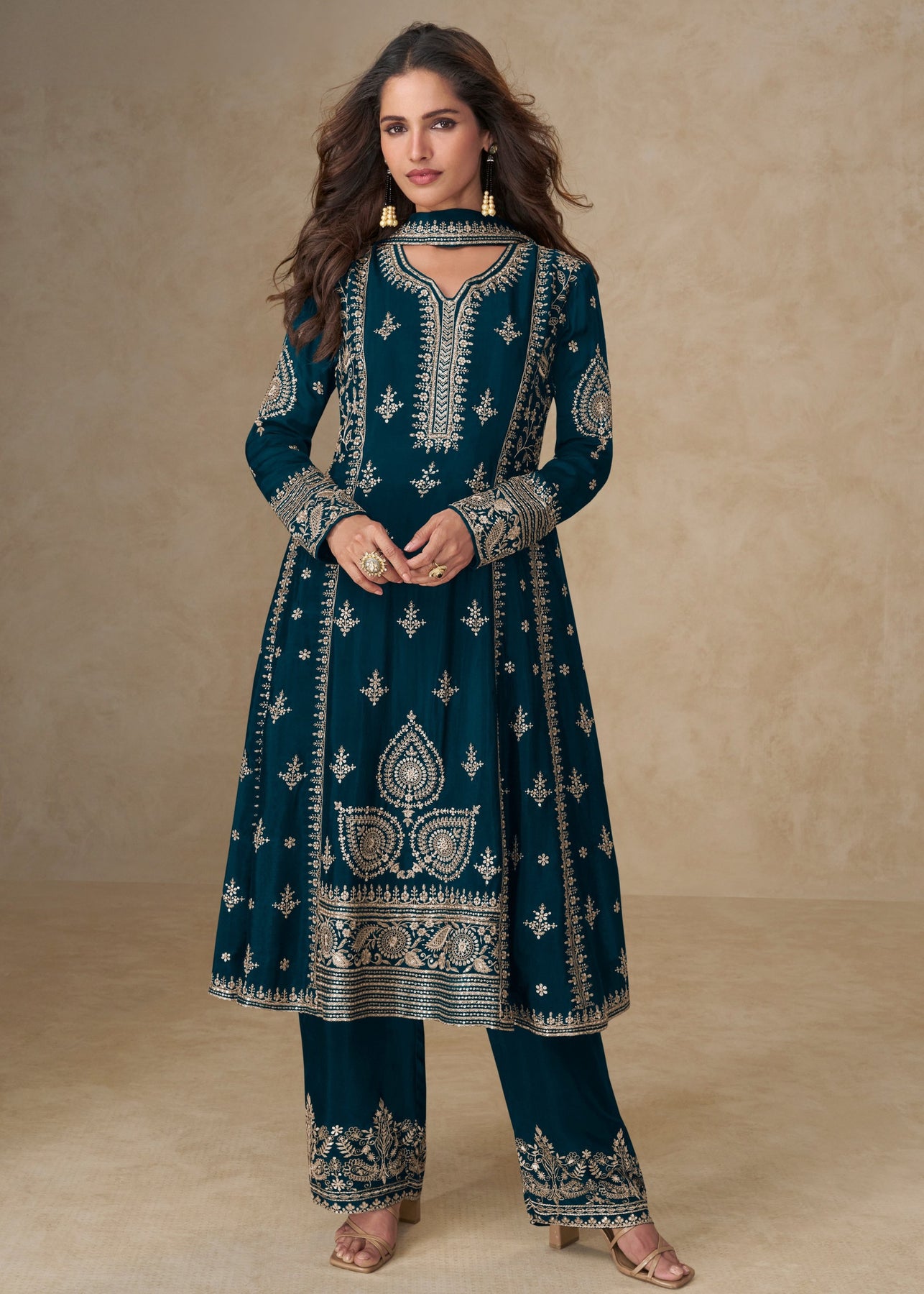 A Aegean blue suit is tailored from blended Chinon silk, offering a soft sheen and graceful drape. Intricate embroidery work enhances the neckline and borders, adding refined detail and visual appeal. It comprises a matching Chinon silk top, bottom, ensuring a cohesive and luxurious ensemble.