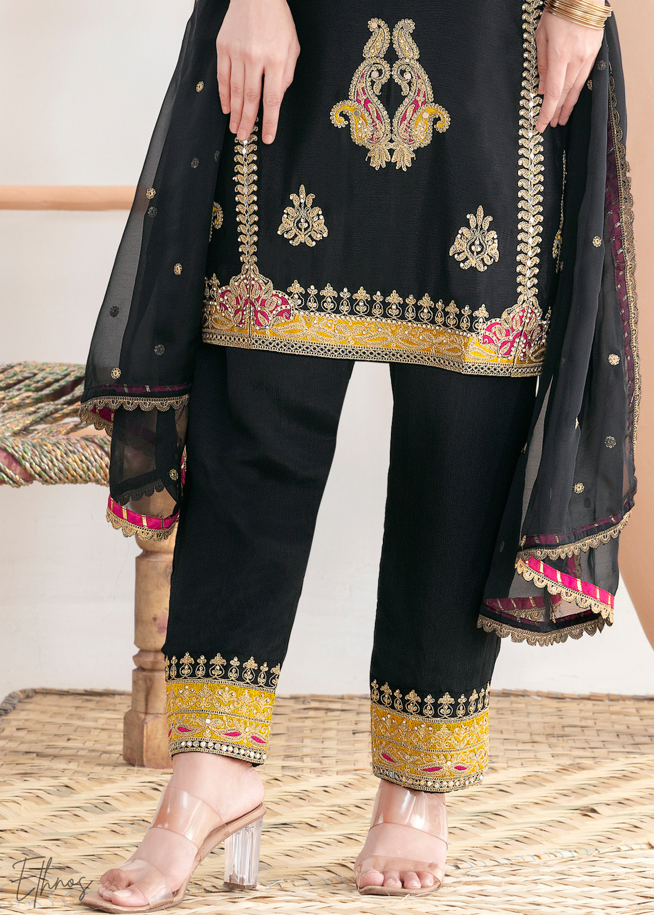 Discover the perfect fusion of heritage and elegance in this captivating top and palazzo suit. Rendered in luxurious chinon fabric, the ensemble showcases meticulous dabka and zari appliqué embroidery that radiates with every gesture. It creates a silhouette that commands presence at weddings, celebrations, and formal occasions.