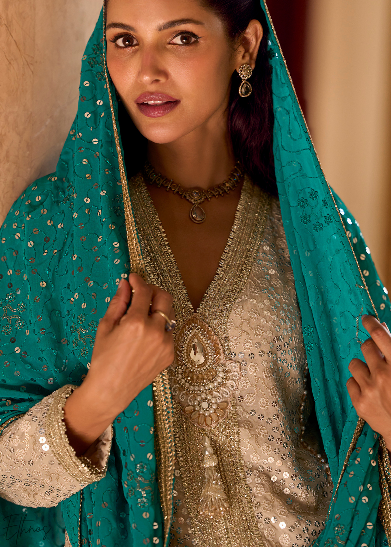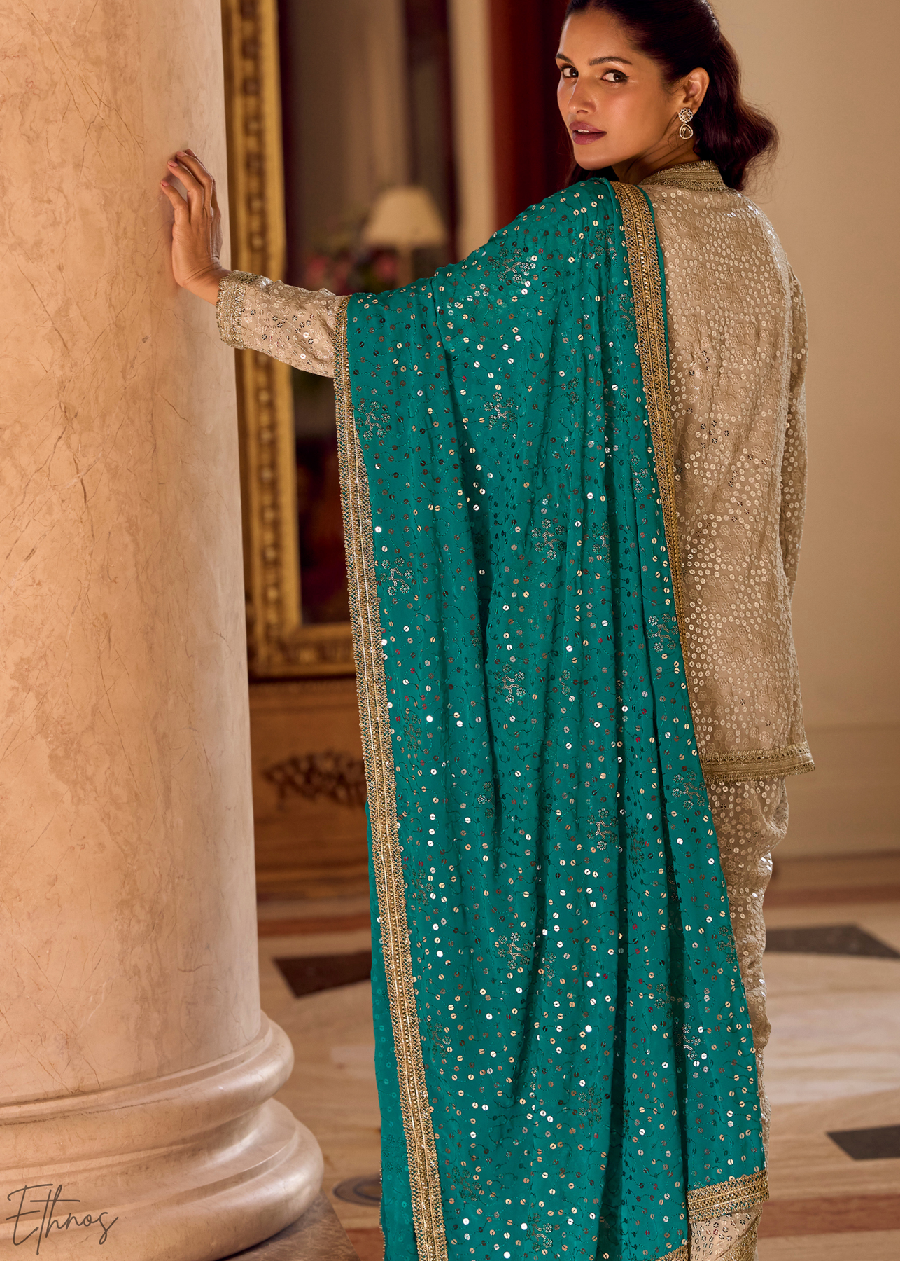 This sophisticated beige dhoti-style ensemble is defined by a dense, shimmering all-over sequin and beadwork pattern on premium georgette. The design features a modern V-neck tunic with traditional tasselled accents and draped dhoti pants, paired with a vibrant teal dupatta for a striking contrast. It’s an ideal choice for weddings, engagement parties, or festive evening celebrations.