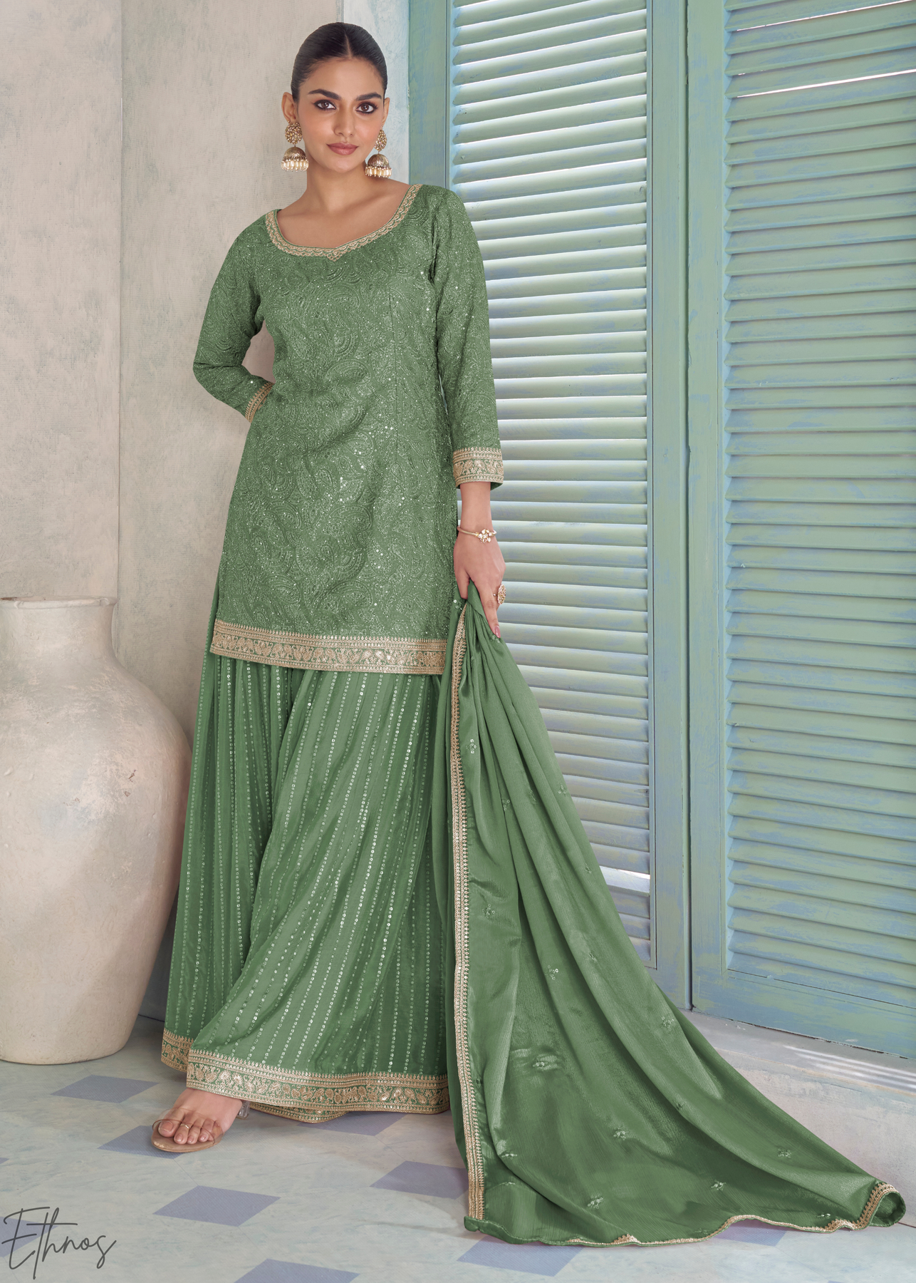 This stunning fern green sharara set features an intricately embroidered short tunic paired with voluminous, tiered bottoms highlighted by shimmering vertical sequin patterns. Detailed zari lace borders finish the hemline and sleeves, creating a refined silhouette that is perfect for festive occasions like mehendi ceremonies, Eid celebrations, or grand wedding festivities.