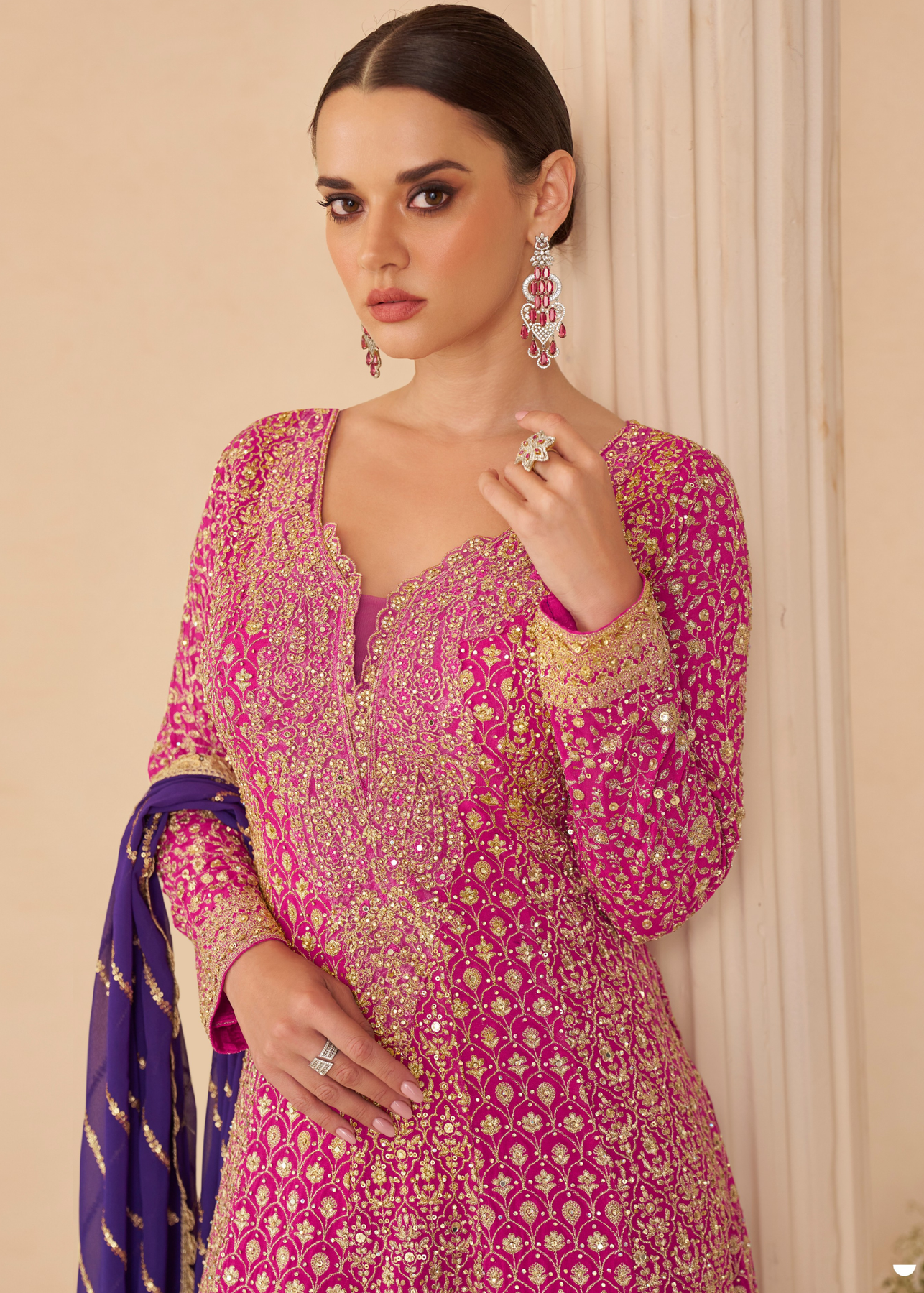 Hot Pink With Gold Embroidery Georgette Palazzo Suit