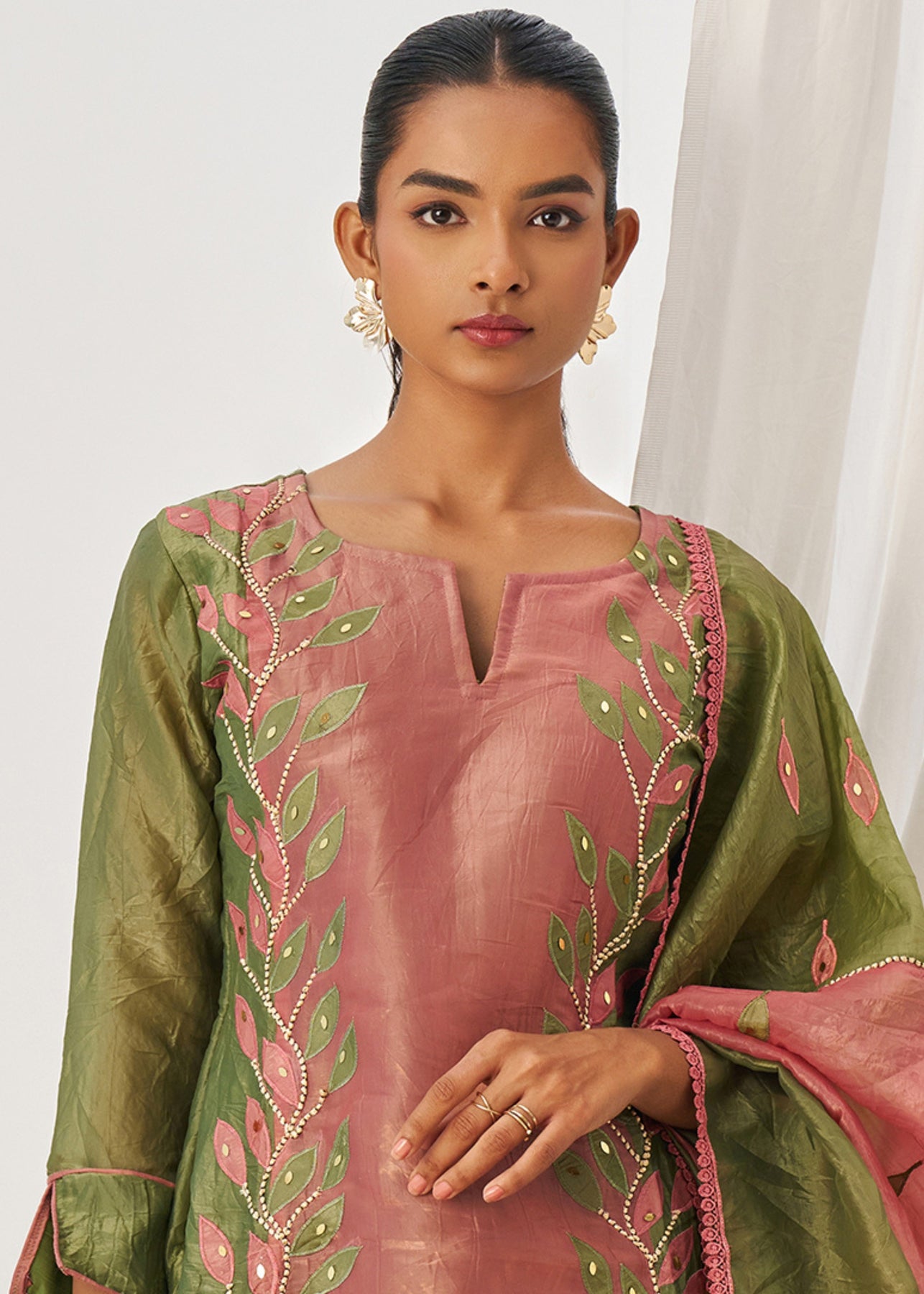 Draped in a luxurious paris green blended crush silk, this elegant pant‑suit set radiates refined charm with its shimmering dupatta and softly tailored silhouette. The top and dupatta, both crafted from plush crush silk, are complemented by santoon underlayers for a comfortable, graceful fit. Intricate embroidery work infuses the ensemble with delicate artistry, striking a perfect balance between traditional craftsmanship and contemporary elegance. Designed for both comfort and poise, this ready‑to‑ship ensemble is ready to elevate any festive or formal occasion with its understated sophistication.