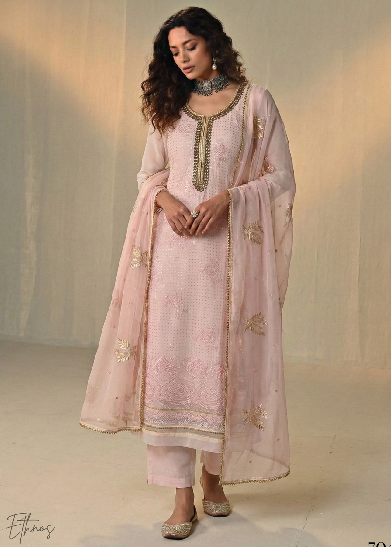 The pastel pink georgette pant suit from ShopEthnos is an elegant ethnic outfit designed for festive and special occasions. It features a graceful georgette top with detailed thread embroidery that enhances its sophisticated look. The set includes a matching santoon pant and a soft net dupatta, creating a complete and stylish ensemble. With its soothing blue shade and modern yet traditional design, it offers a perfect blend of comfort and elegance.