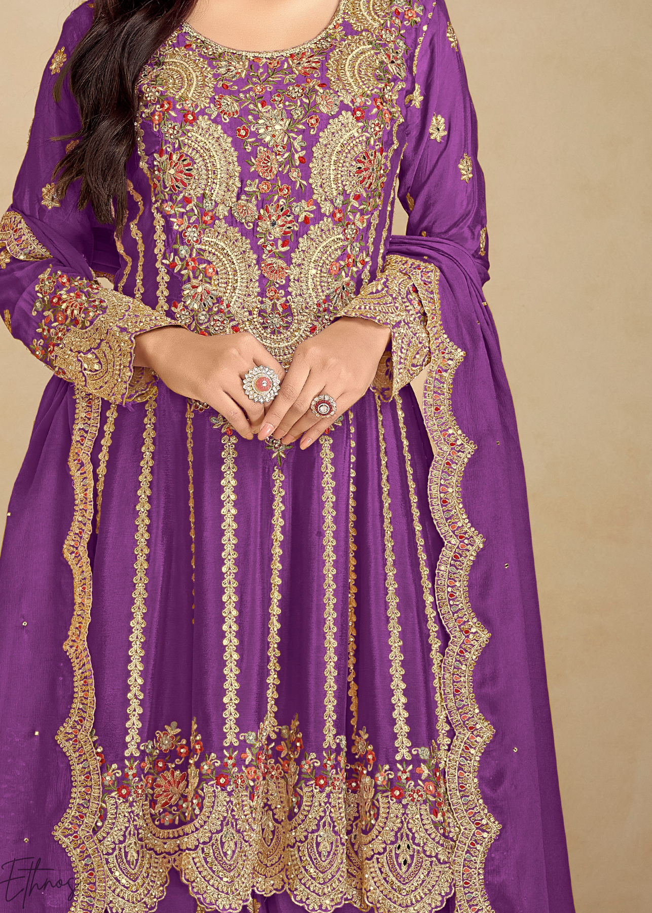 Purple Embroidered Chinon Anarkali Sharara Suit