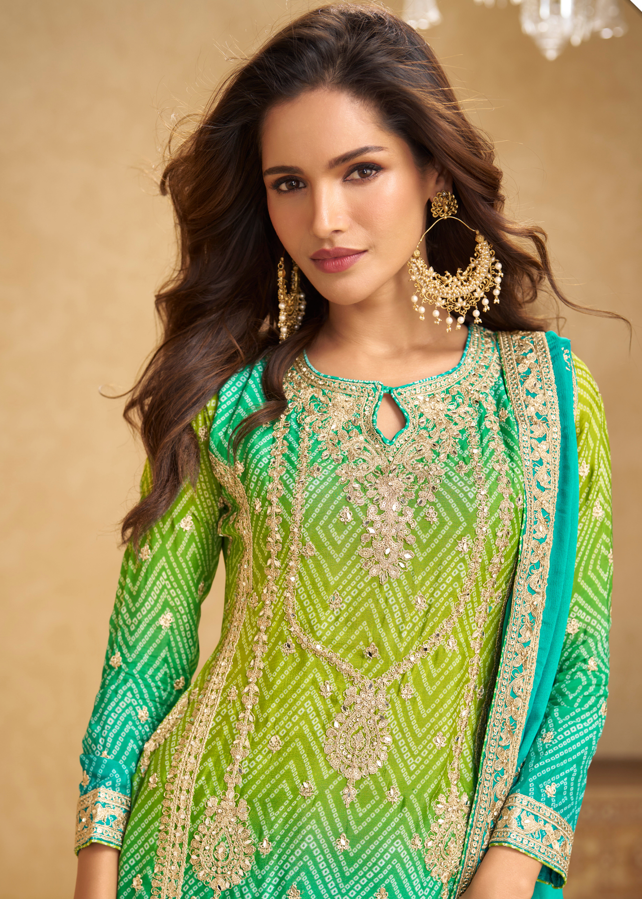The Sea Green – Lime Ombre Chinon Palazzo Suit is styled as a palazzo-set, with a top (kurti), matching wide-leg palazzo pants, and a dupatta — giving a contemporary yet ethnic silhouette that’s versatile enough for both festive events and casual/semiformal gatherings. The color scheme is a sea-green to lime ombré, giving a fresh, “awake” vibe — the gradual transition between sea-green and lime shades creates a soft, stylish gradient effect that feels modern and vibrant.