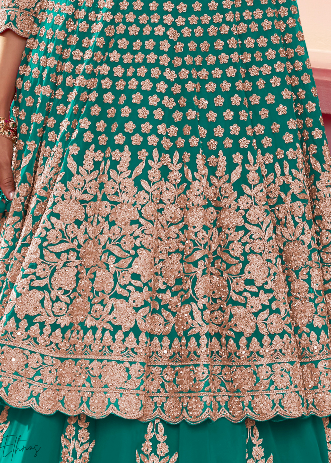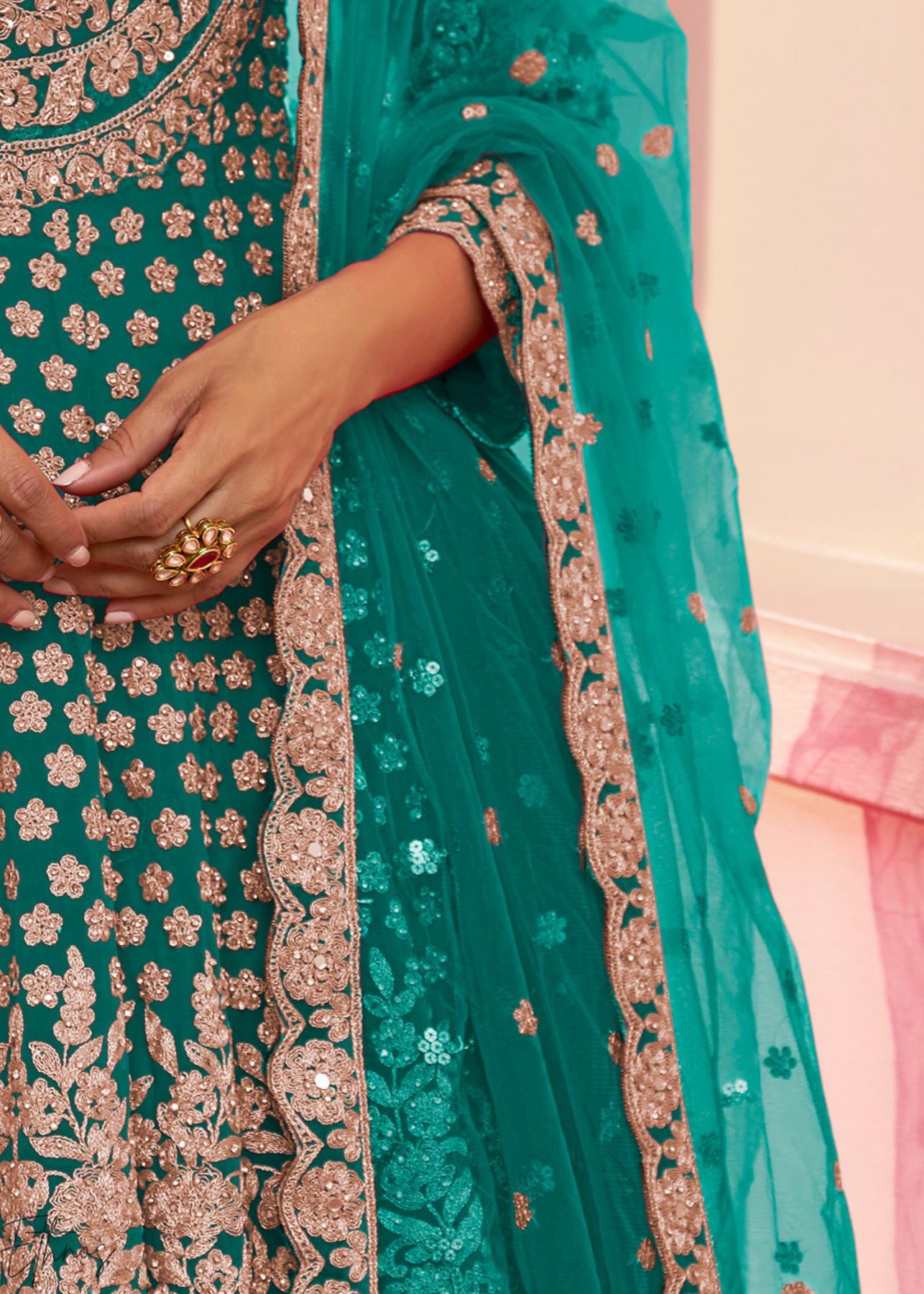 This elegant teal green party wear suit features a real georgette top and matching skirt, both intricately detailed with elaborate embroidery. The three-piece ensemble is completed with a delicate net dupatta, also adorned with fine embroidery. Designed for a classic silhouette, the top and skirt combination makes it an ideal choice for weddings and festive occasions.