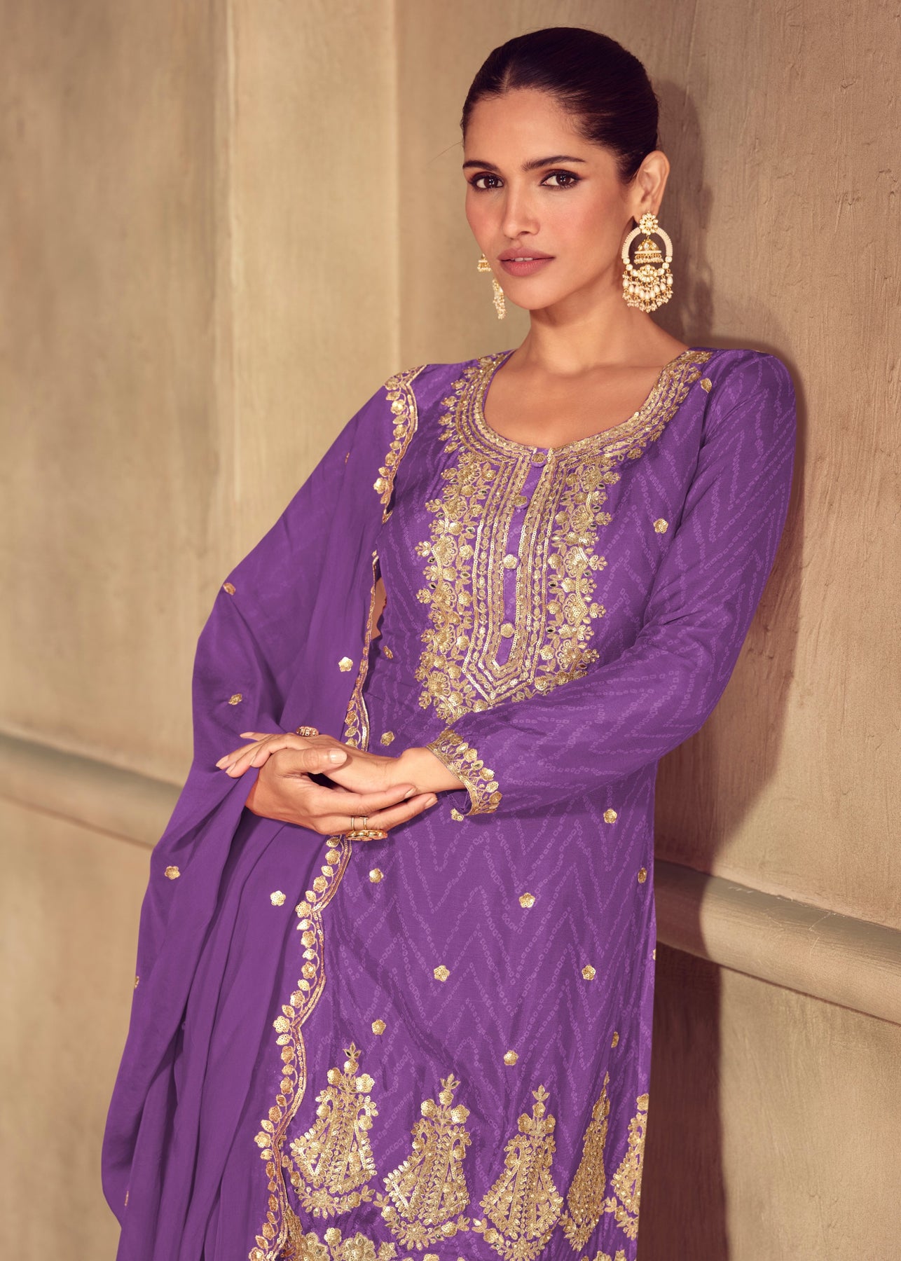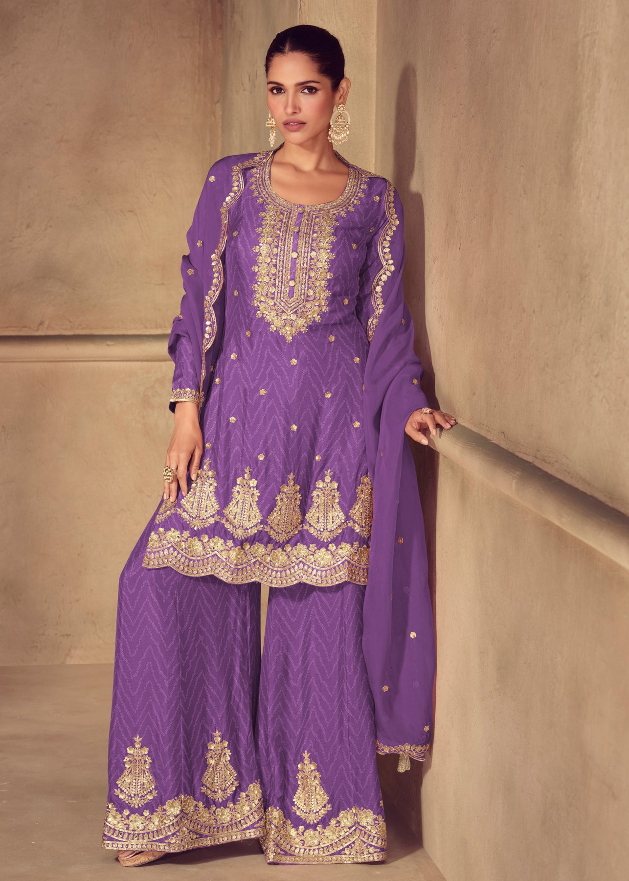 The Violet Chinon Digital Print Salwar Suit is a graceful blend of traditional charm and contemporary aesthetics. Crafted in soft chinon fabric, it offers a luxurious drape with a subtle sheen that instantly elevates your ethnic look. The lightweight texture makes it breathable and comfortable for long wear, while still maintaining a polished, festive appearance. Ideal for festive occasions, family functions, or social gatherings, this outfit allows you to make a statement without going over the top.