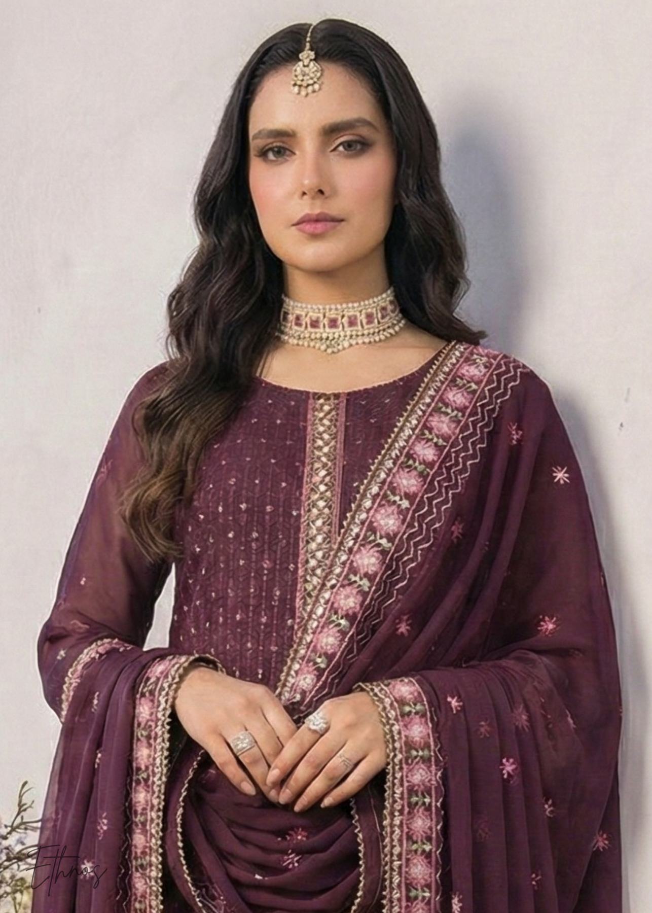 The Wine-Plum with Muted Gold Embroidery Pant Suit is an elegant ethnic ensemble, designed to blend contemporary fashion with classical Indian craftsmanship. Draped in a deep wine-plum hue, the outfit is accentuated with delicate muted gold embroidery that brings a subtle yet rich ornamental appeal — making it suitable for festive occasions, weddings, and cultural celebrations.