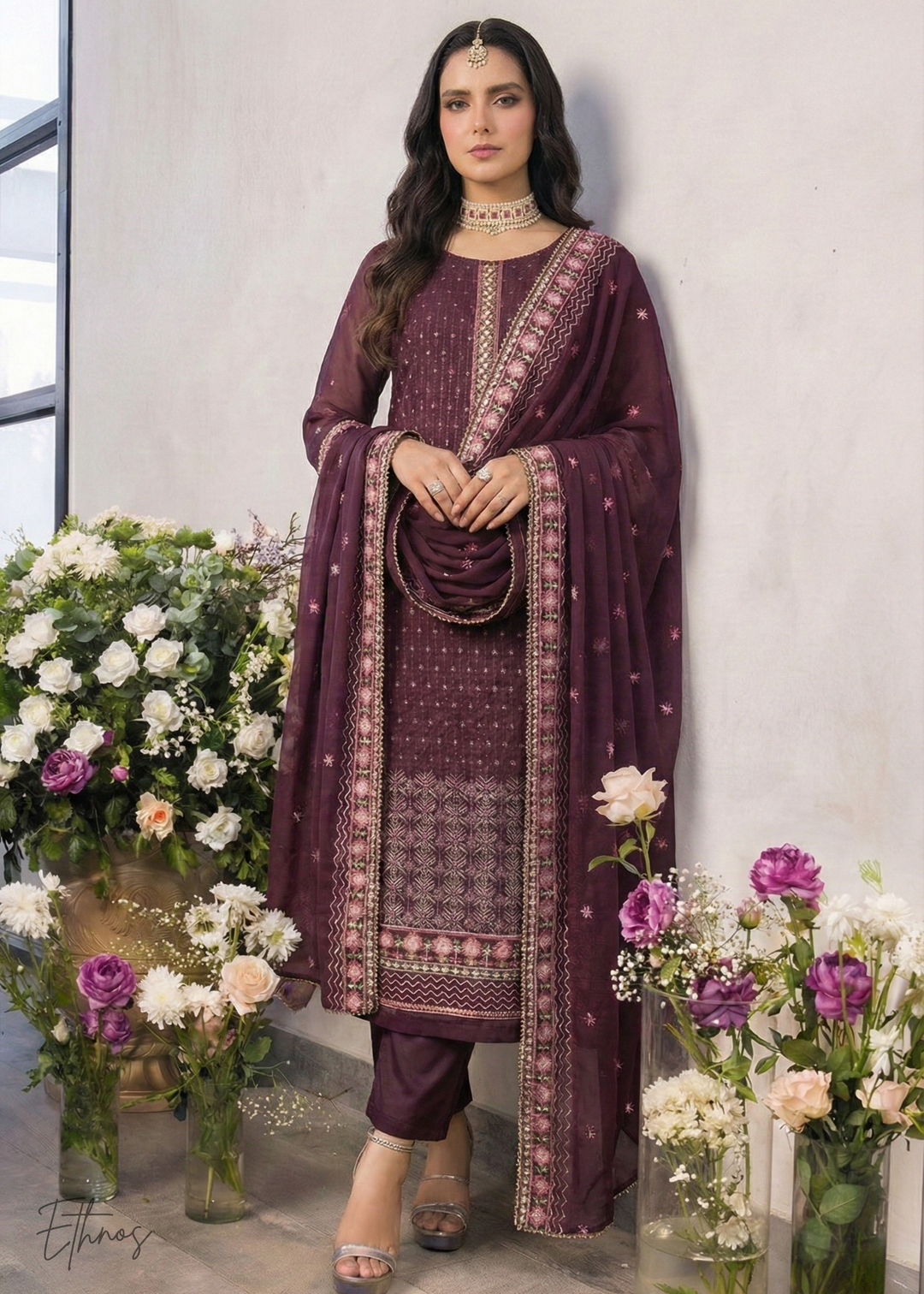 Wine-Plum with Muted Gold Embroidery Pant Suit