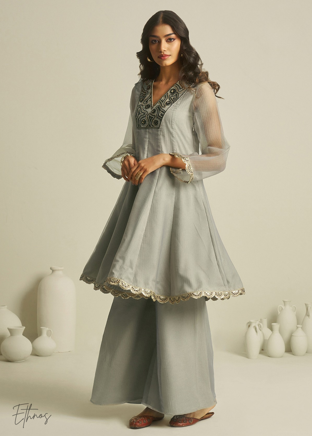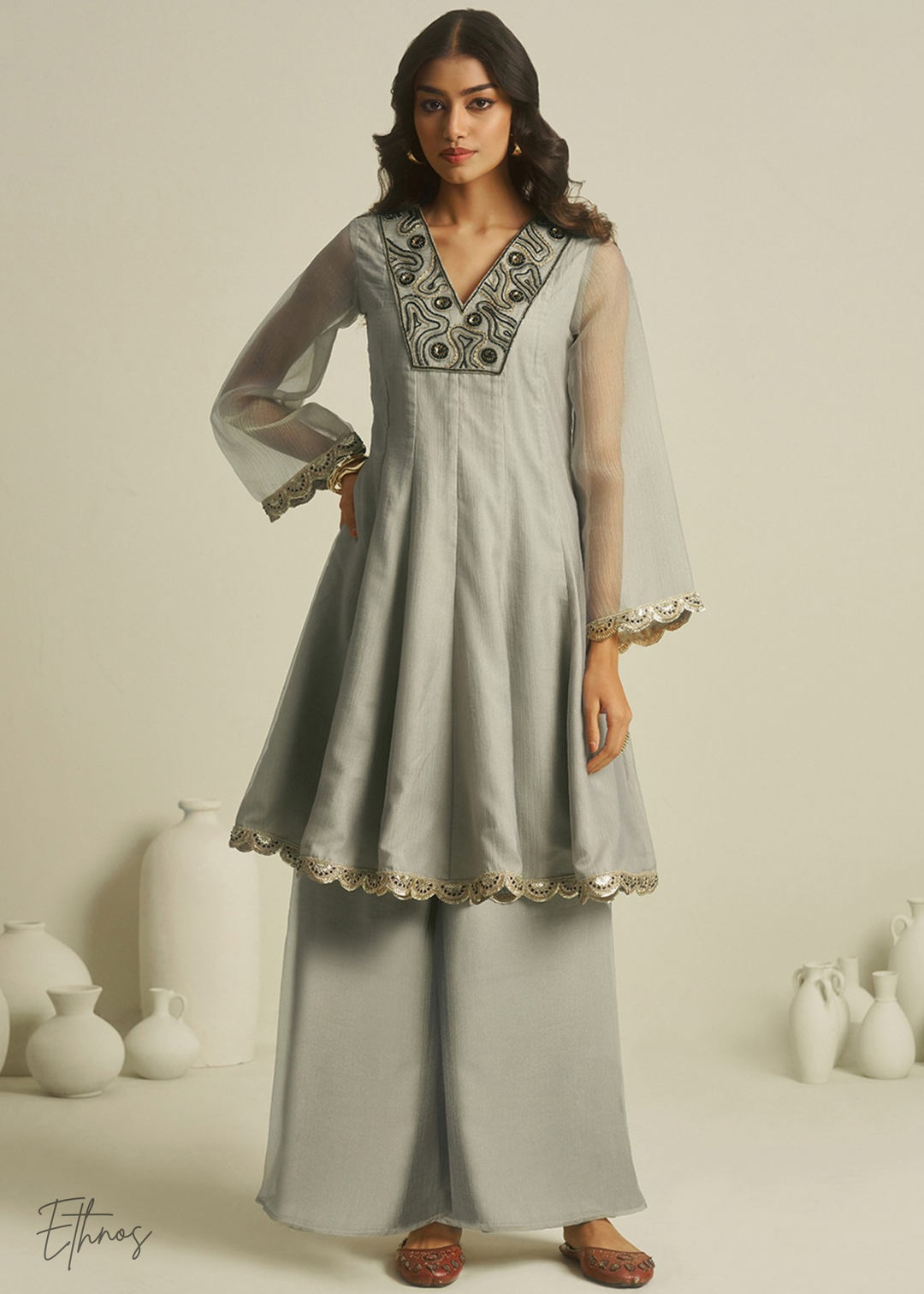 Olive Grey Chinon Palazzo Salwar Suit