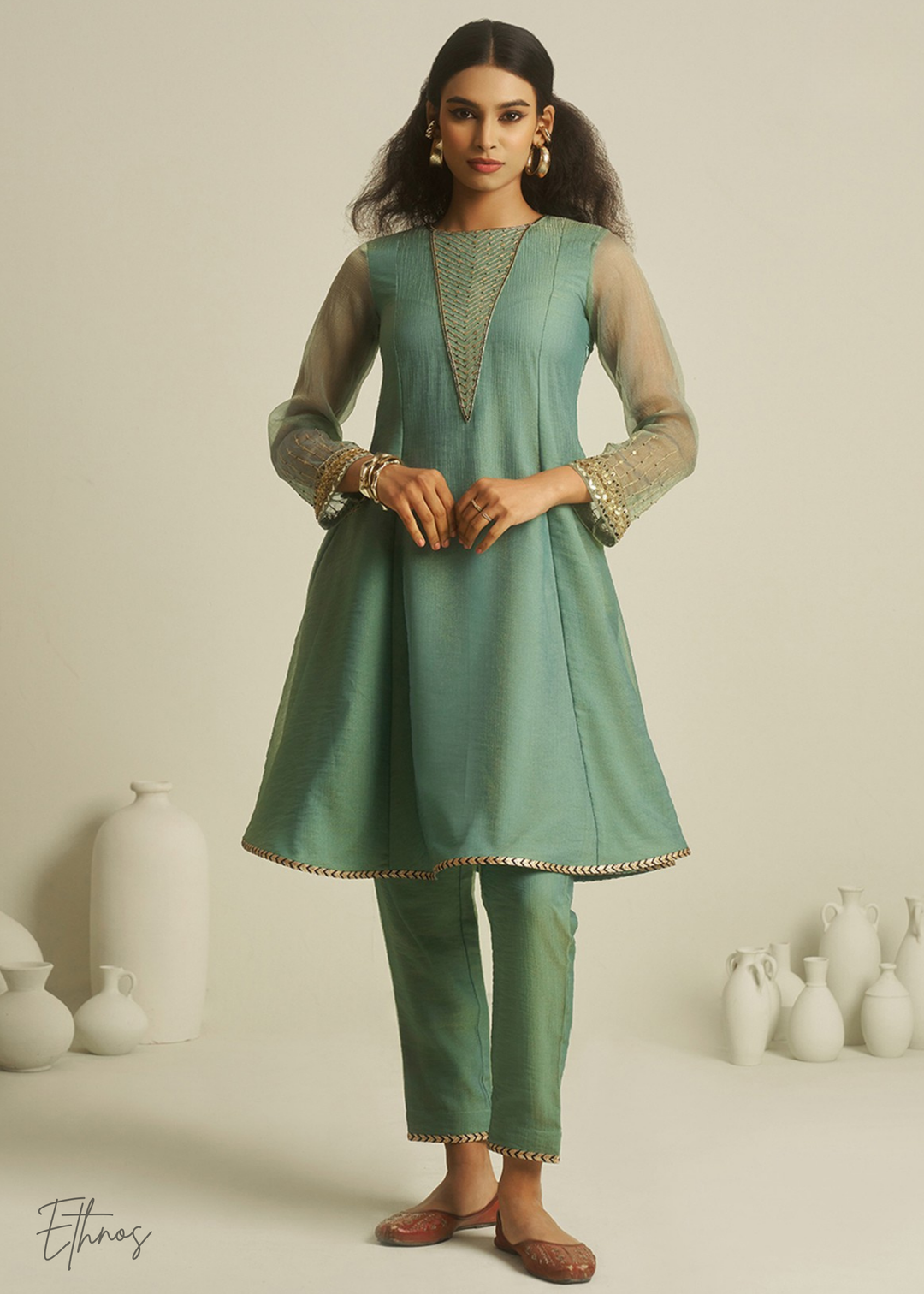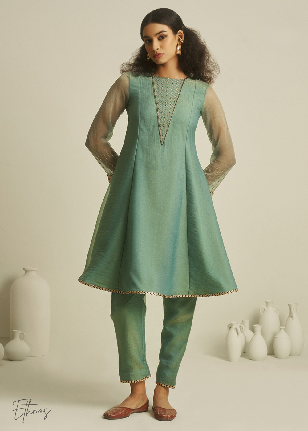 Sea Green Tissue Handwork Kurta With Pant