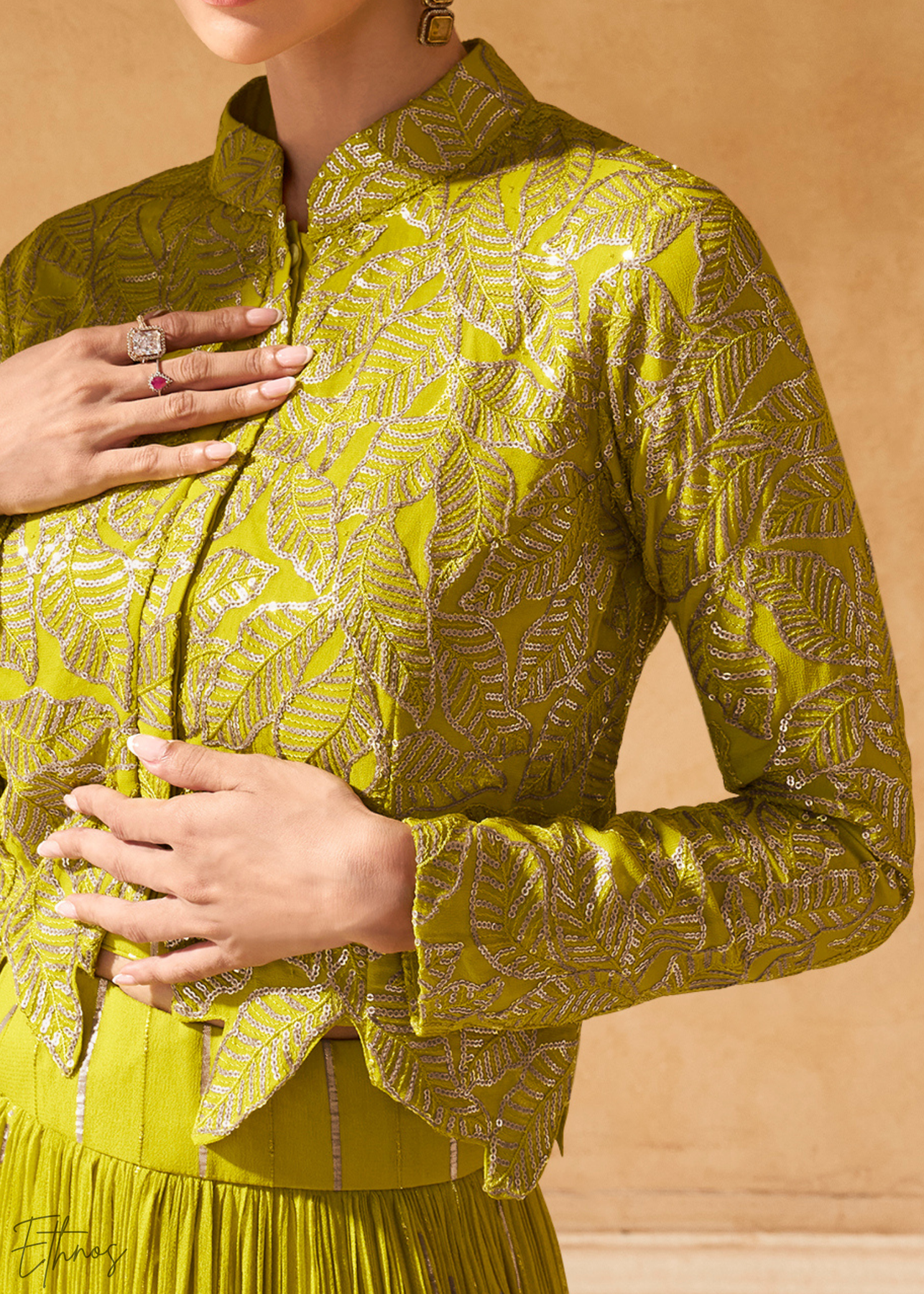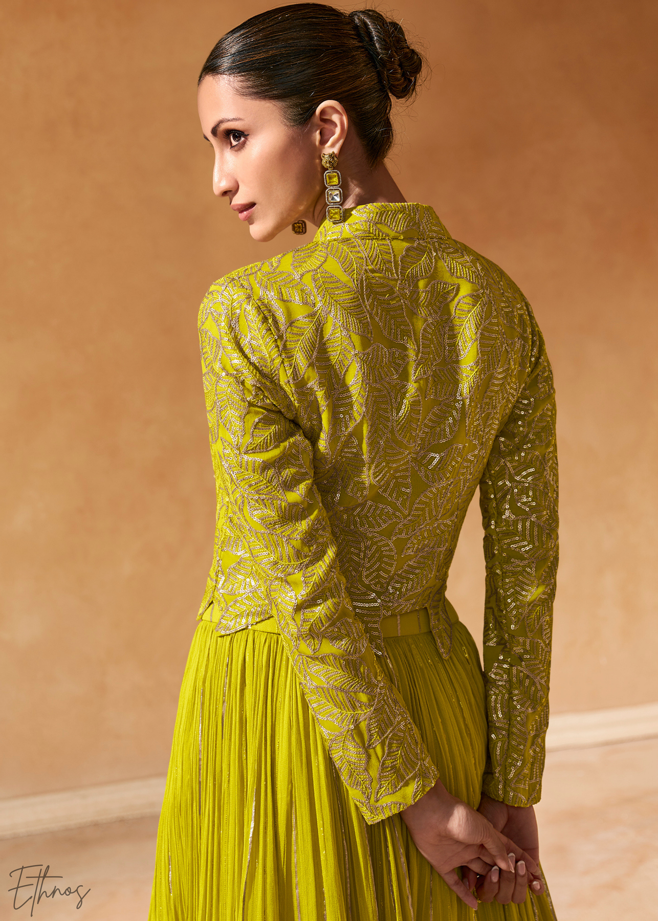 This lime green chinon shrug skirt set is crafted from lightweight and breathable fabric for a graceful drape. The ensemble features a vibrant hue complemented by subtle shimmer and a shrug that adds a contemporary layer of sophistication. This stylish set is an excellent choice for mehendi functions, haldi ceremonies, or daytime festive brunches where you want a bright and breezy look.