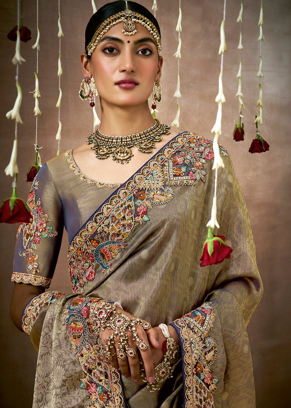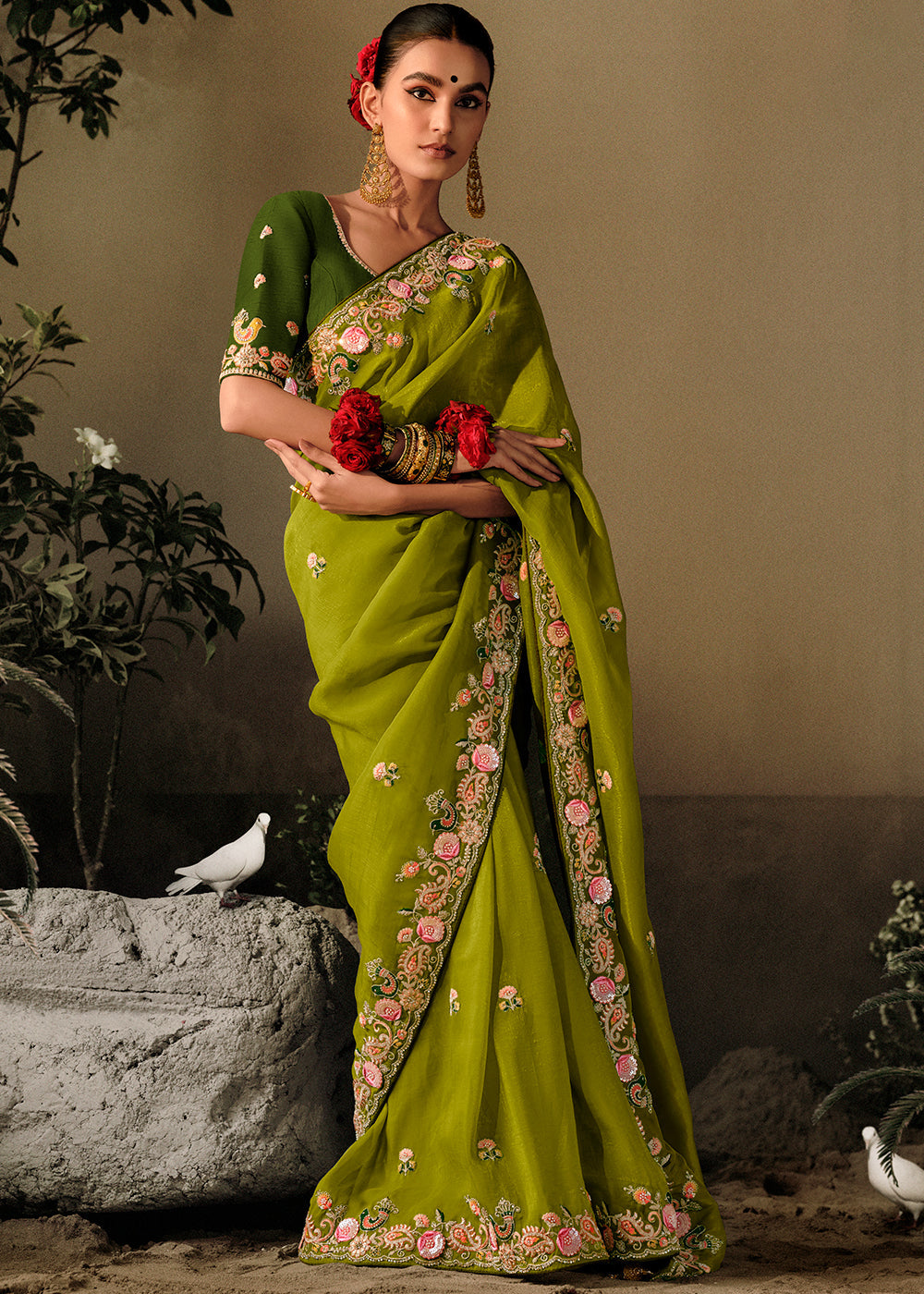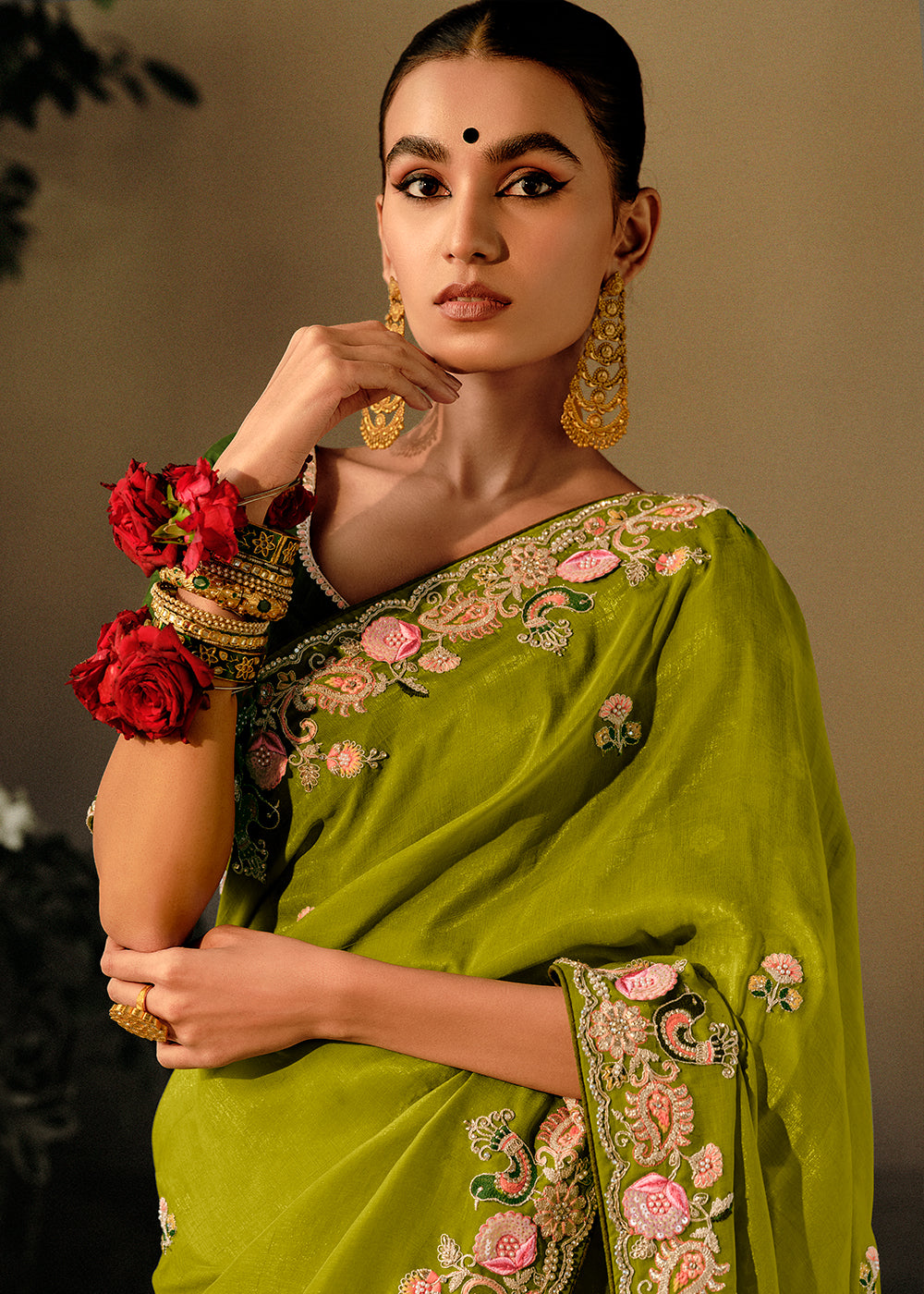 Olive Green Zari Woven Tissue Dola Silk Saree having Sequence, Pearl, Mirror & Thread Work: Festival Edition