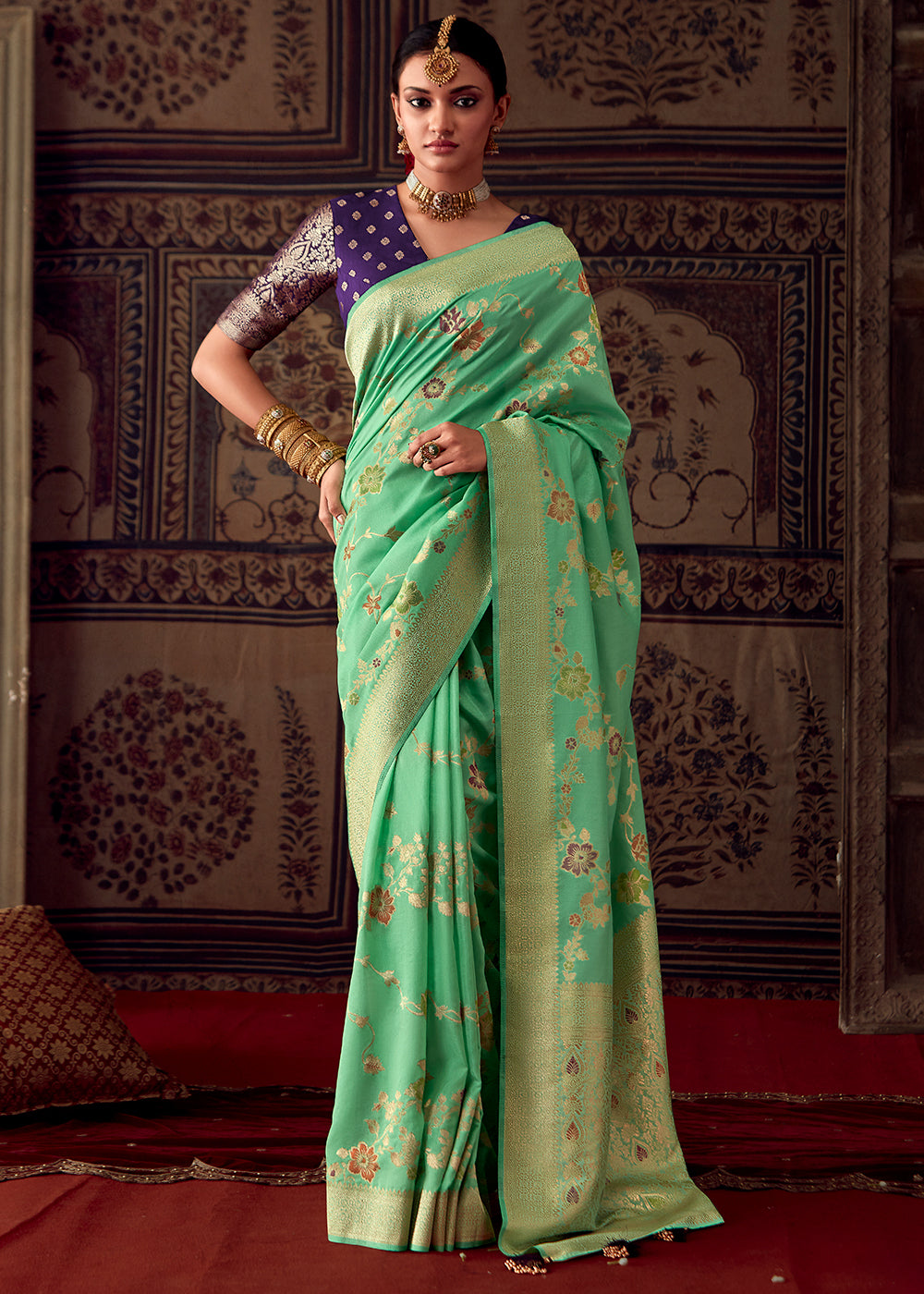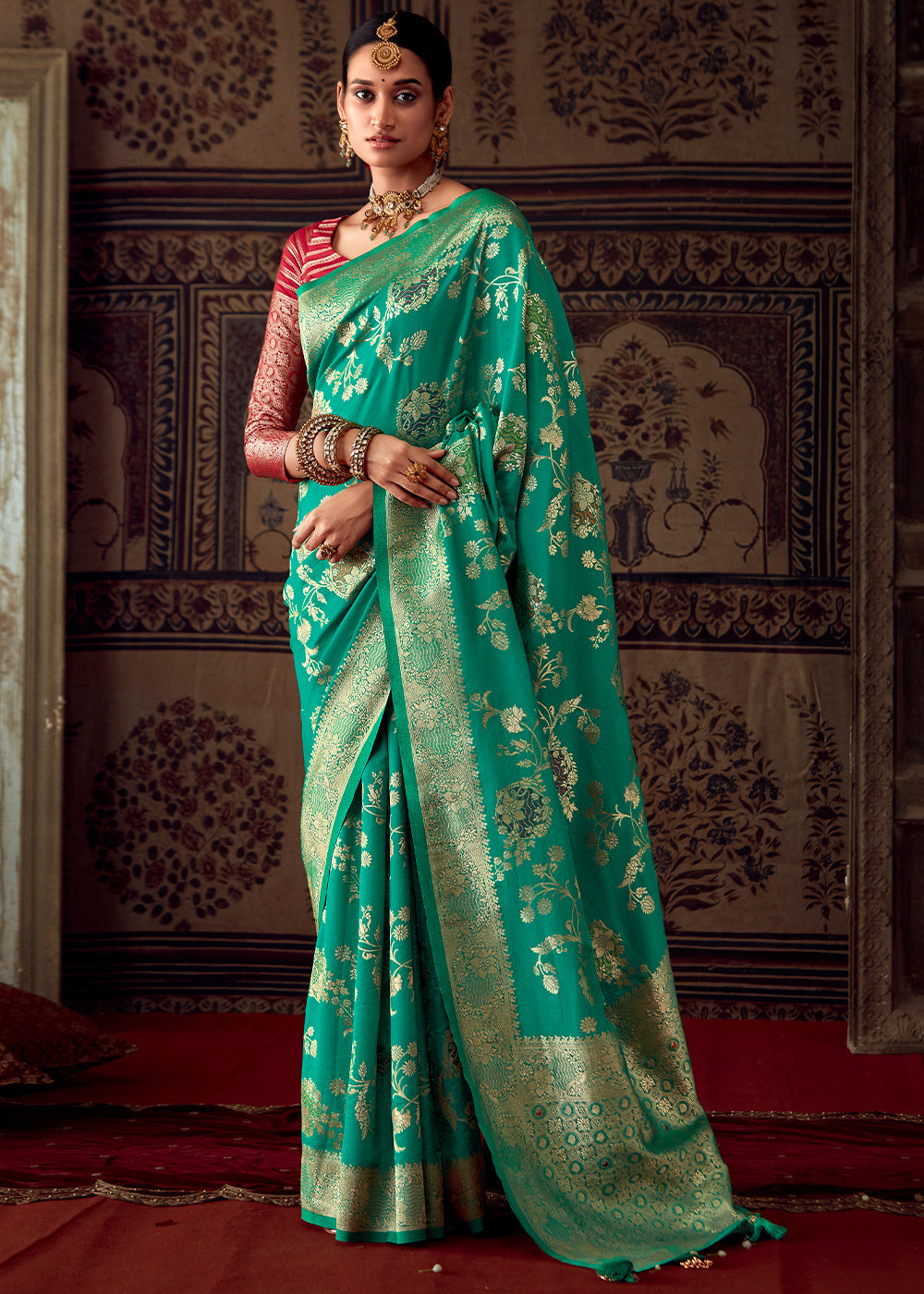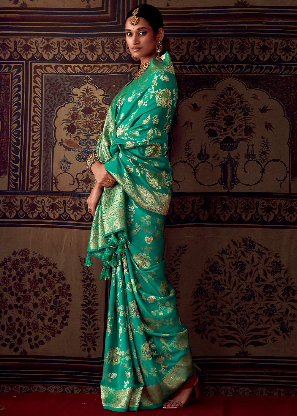 Sea Green Pure Viscose Dola Silk Saree with Zari Weaving & Embroidered Blouse