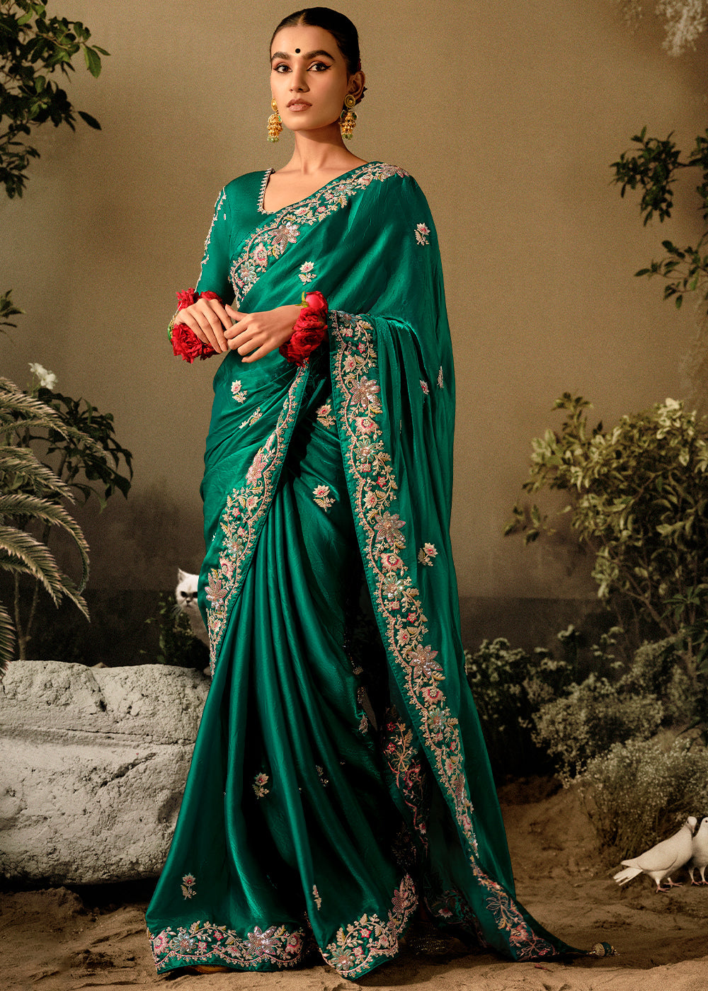 Dark Greasy Green Dola Silk Saree with Hand Embroidery work