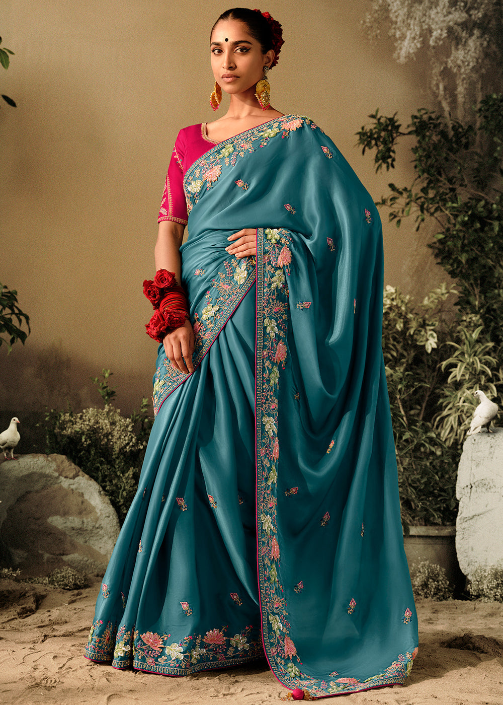 Teal Blue Woven Dola Silk Saree with Embroidered Blouse