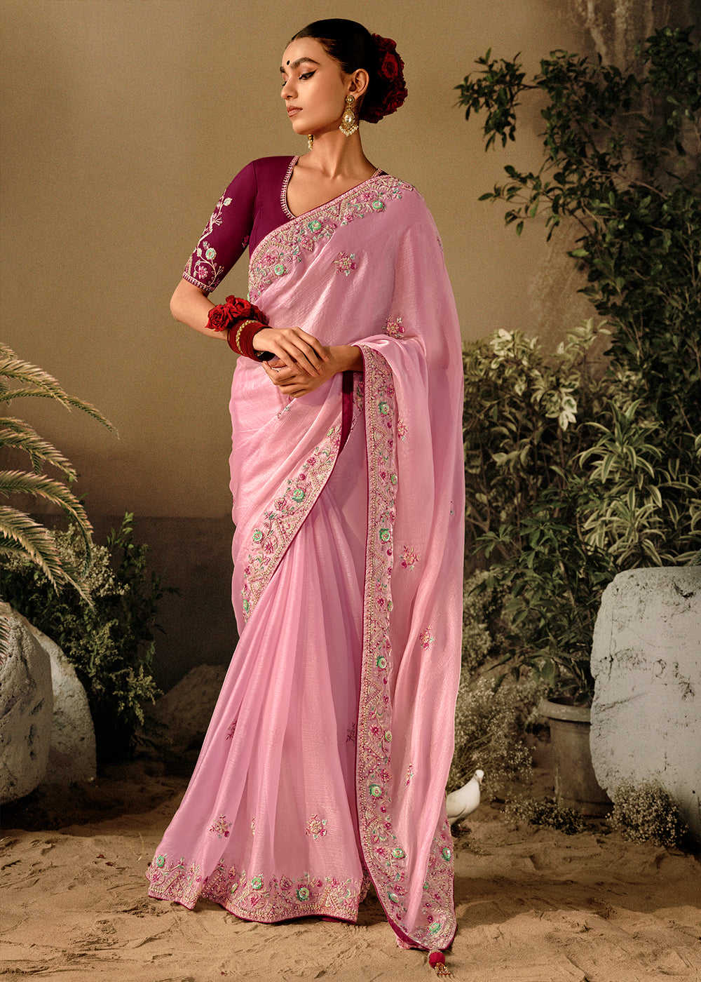 Cerise Pink Dola Silk Saree with Heavy Embroidery work (Pre-Order)